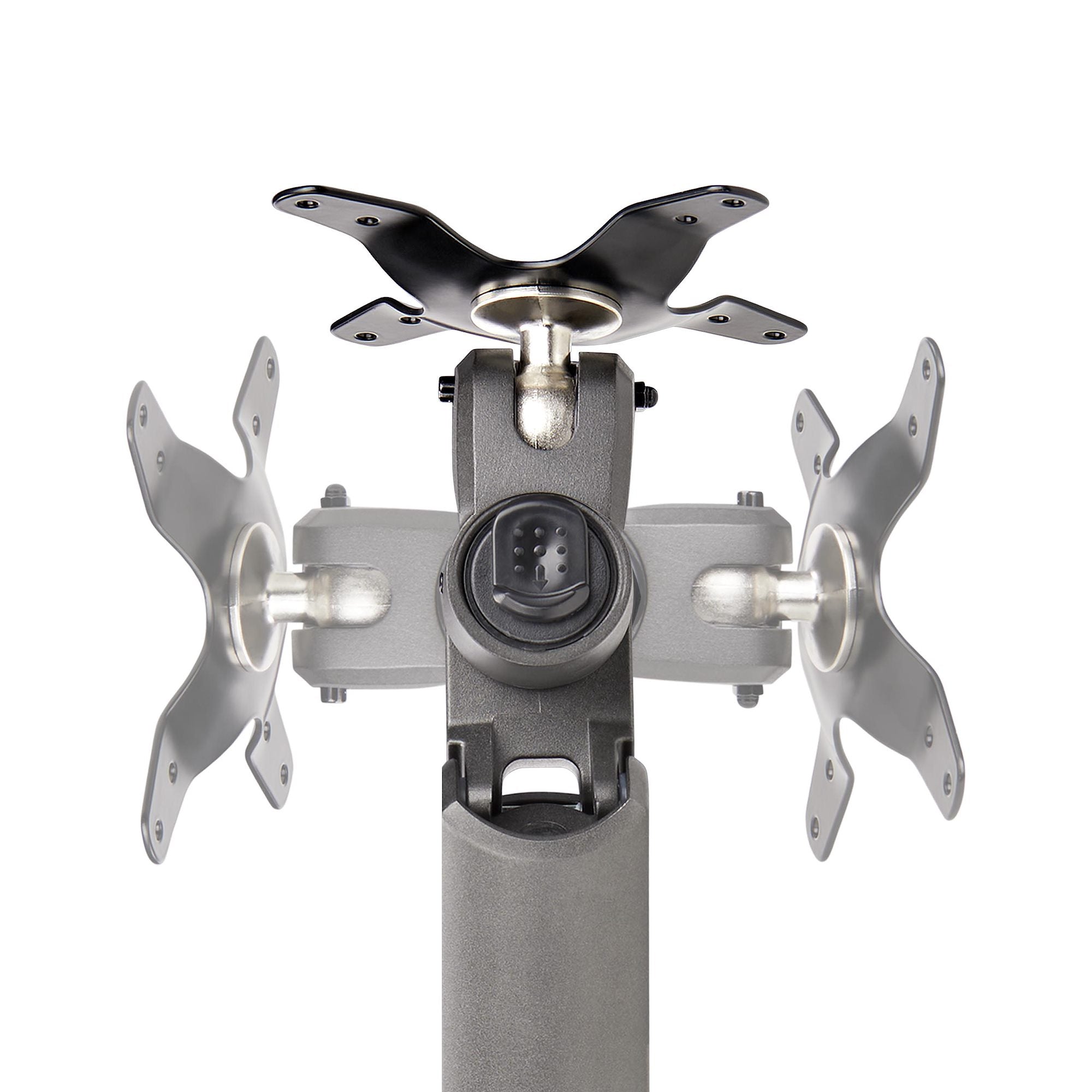 The monitor arm comes pre-assembled and includes a VESA monitor plate that uses thumb screws to securely mount the monitor quickly and without additional tools.