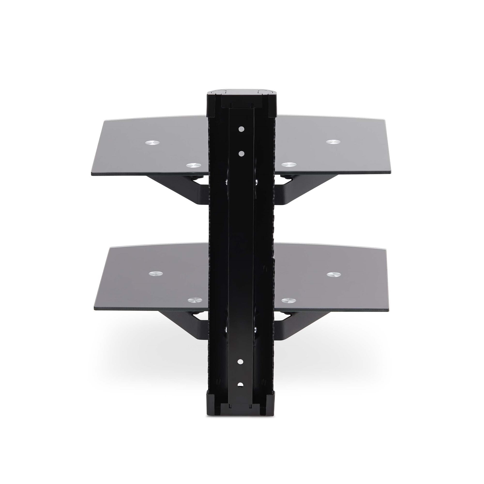 Organize TV accessories with this wall-mounted height-adjustable two-shelf system