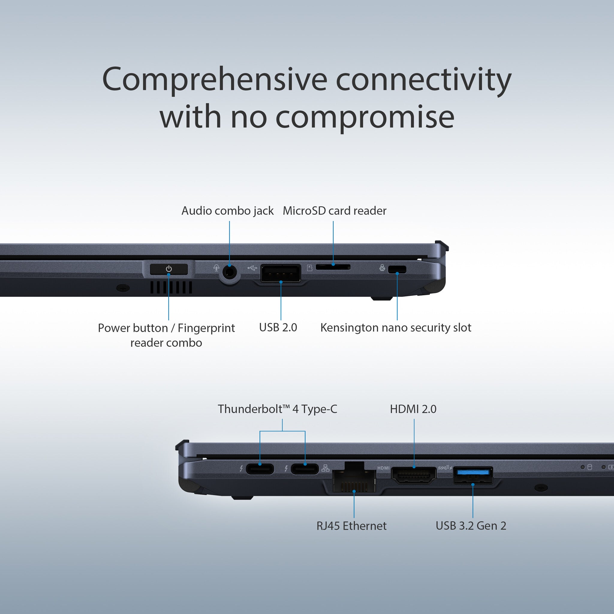 Despite its thin profile, ExpertBook B5402 is loaded with I/O ports. These include cutting-edge Thunderbolt™ 4, the next generation of the universal cable connectivity solution that offers support for the next-level USB4 interface, 40 Gbps data transfer speeds, 4K display output and fast charging. The laptop also offers a microSD card reader and an HDMI output, plus an RJ45 Ethernet port, with a unique MAC address for easy device management.