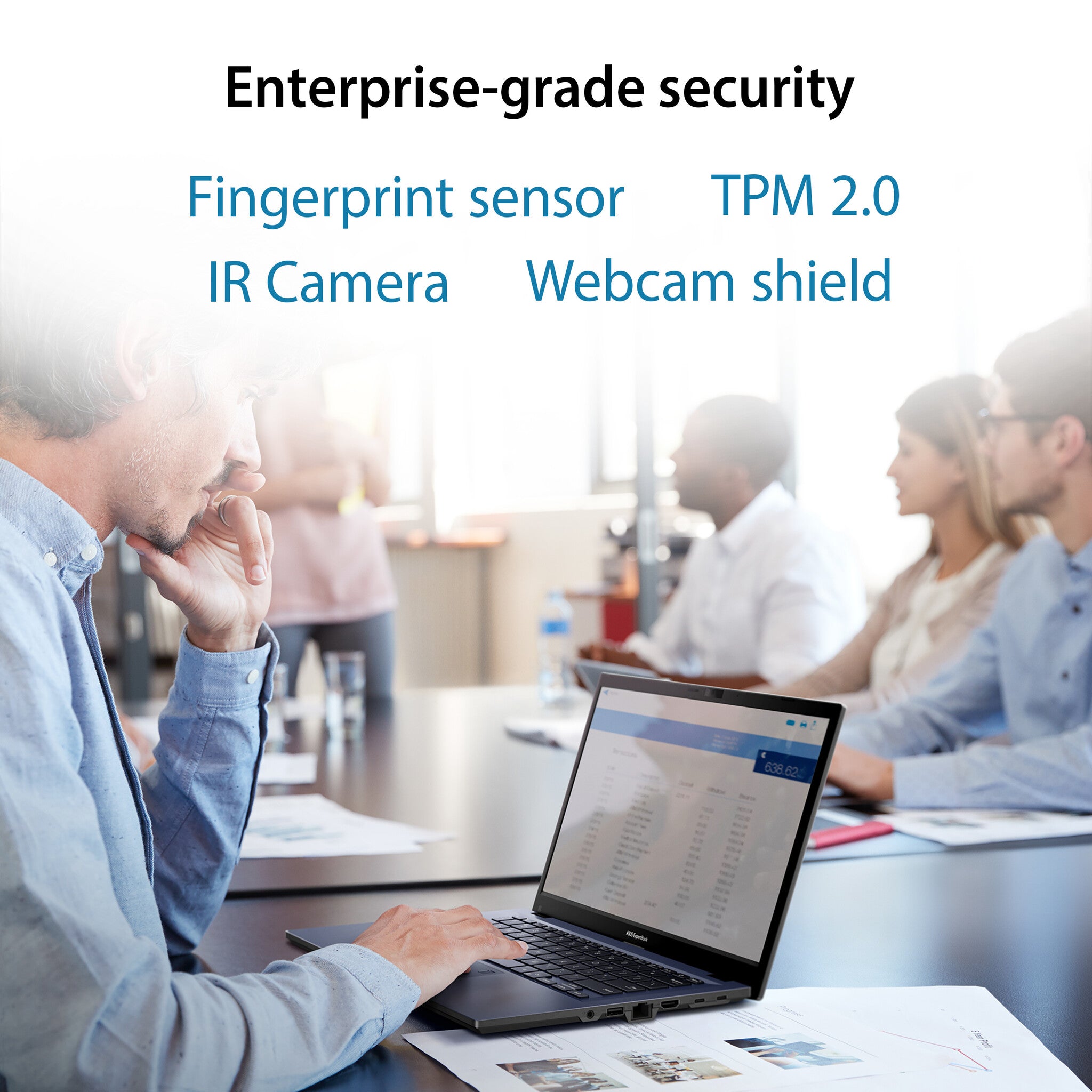 Engineered with robust features that include face login, a fingerprint sensor, a Kensington lock slot1, a physical webcam shield, and TPM 2.02 security, ExpertBook B1402 delivers security that’s fit for business — offering serious safety and protection for your premium device and priceless data.