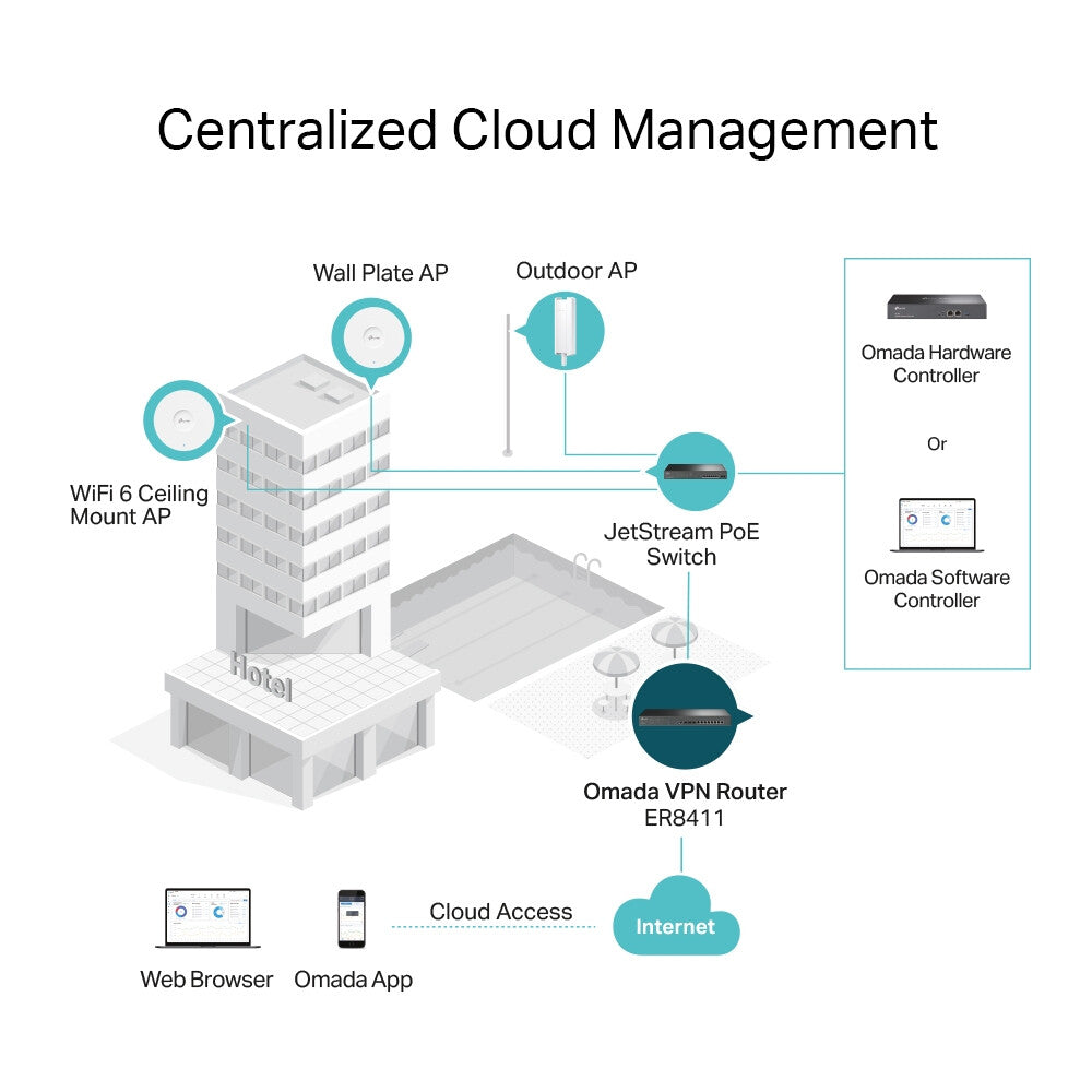 The Omada Software Defined Networking (SDN) platform integrates network devices including access points, switches, and routers to provide 100% centralized cloud management and create a highly scalable network—all controlled from a single interface.