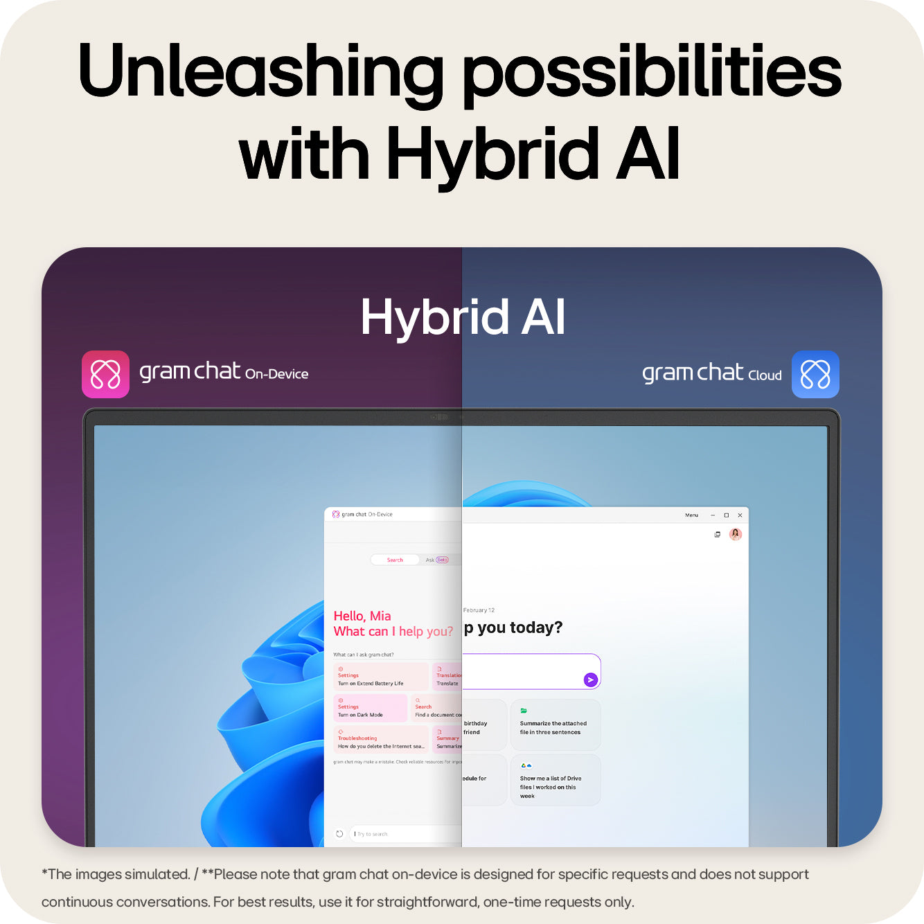 Experience Hybrid AI that combines cloud and on-device AI to deliver professional results, enhanced by the powerful capabilities of the Copilot and gram AI for elevated productivity