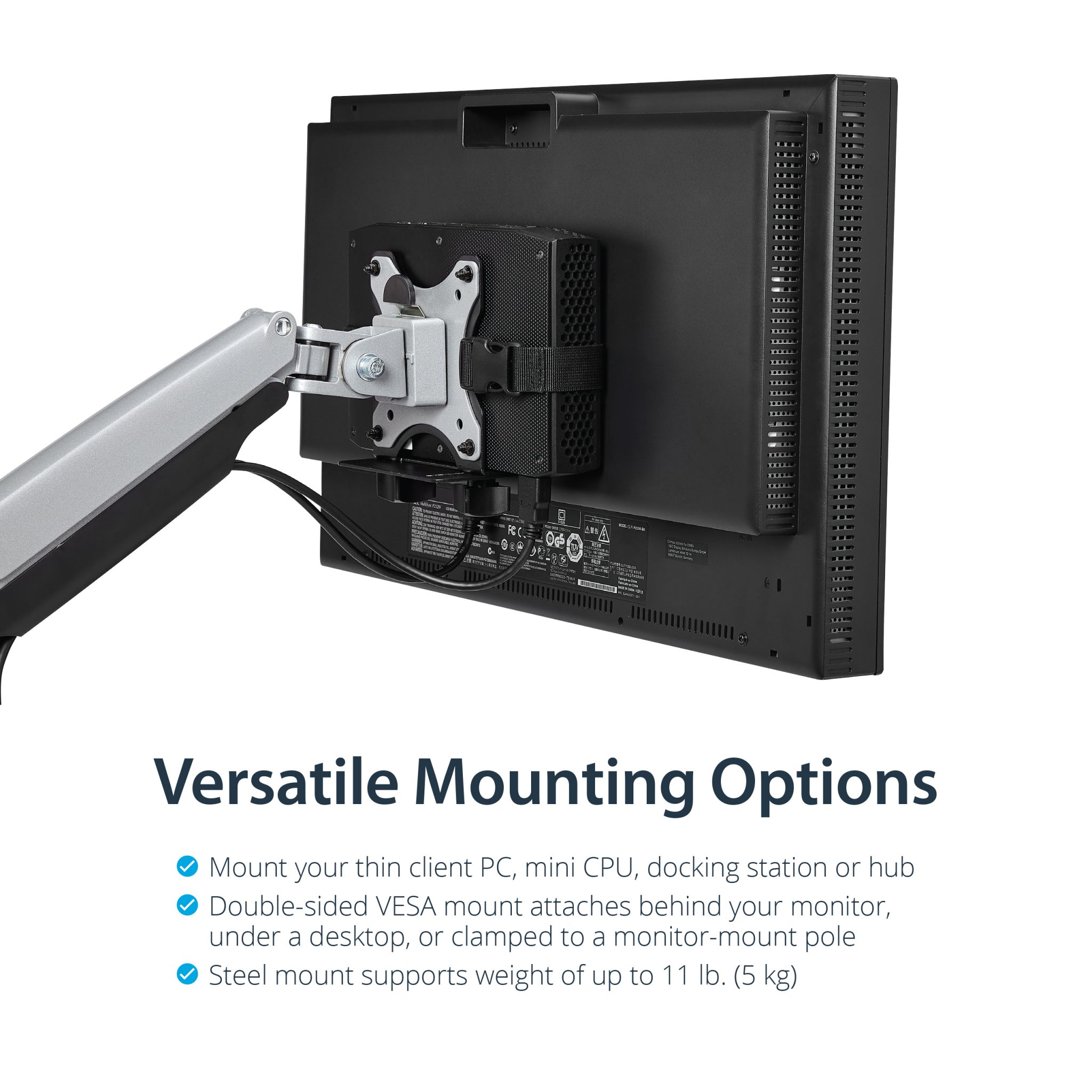 Save space and neatly mount your docking station, thin client or USB hub to a VESA mount, behind your monitor, or under your desk