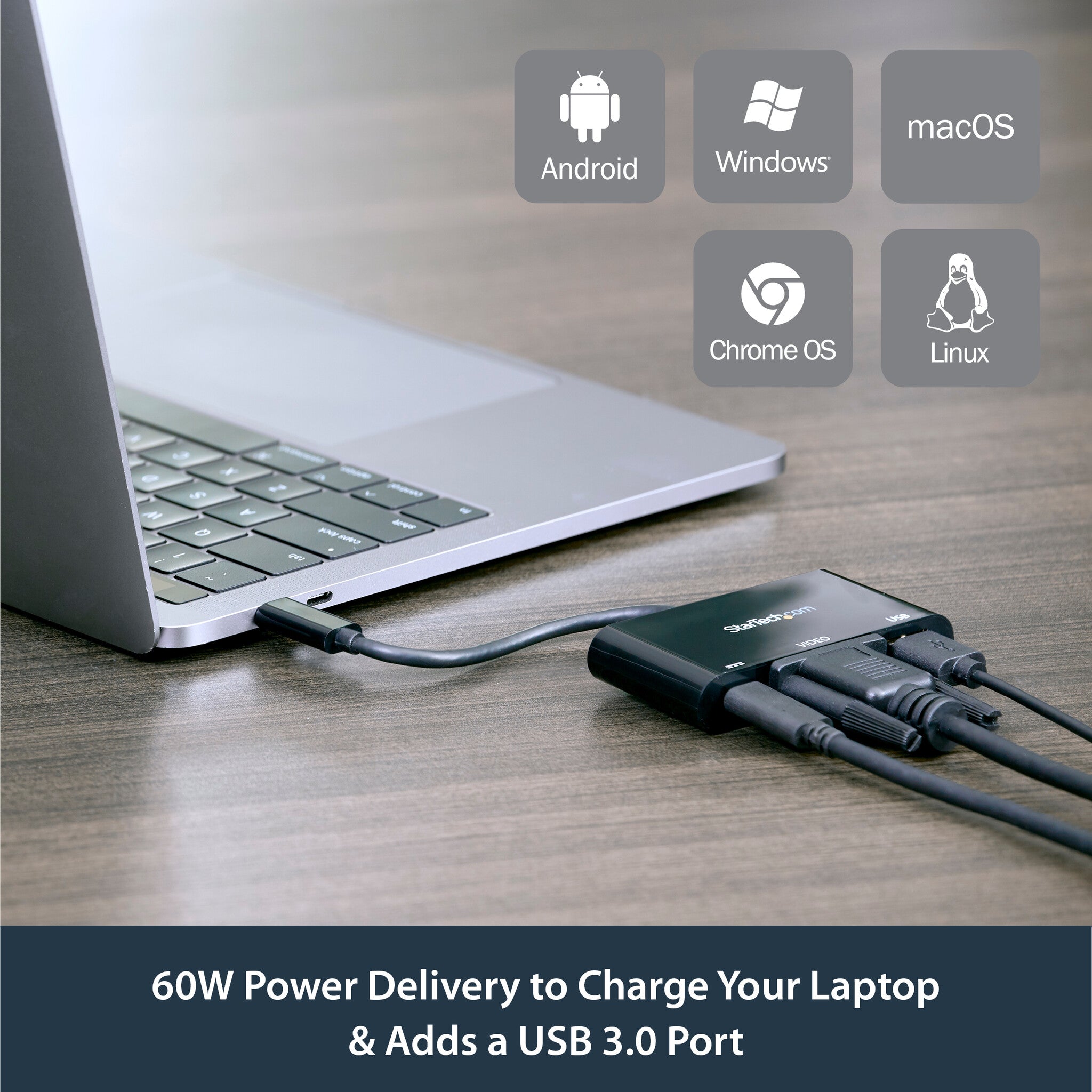 This USB-C VGA multiport adapter combines the capability of two single-function adapters, a USB-C video adapter and USB-C to USB adapter, into a portable docking station for your laptop. You can instantly connect to a VGA display and a USB 3.0 (Type-A) device, while also powering and charging your laptop using the same adapter.