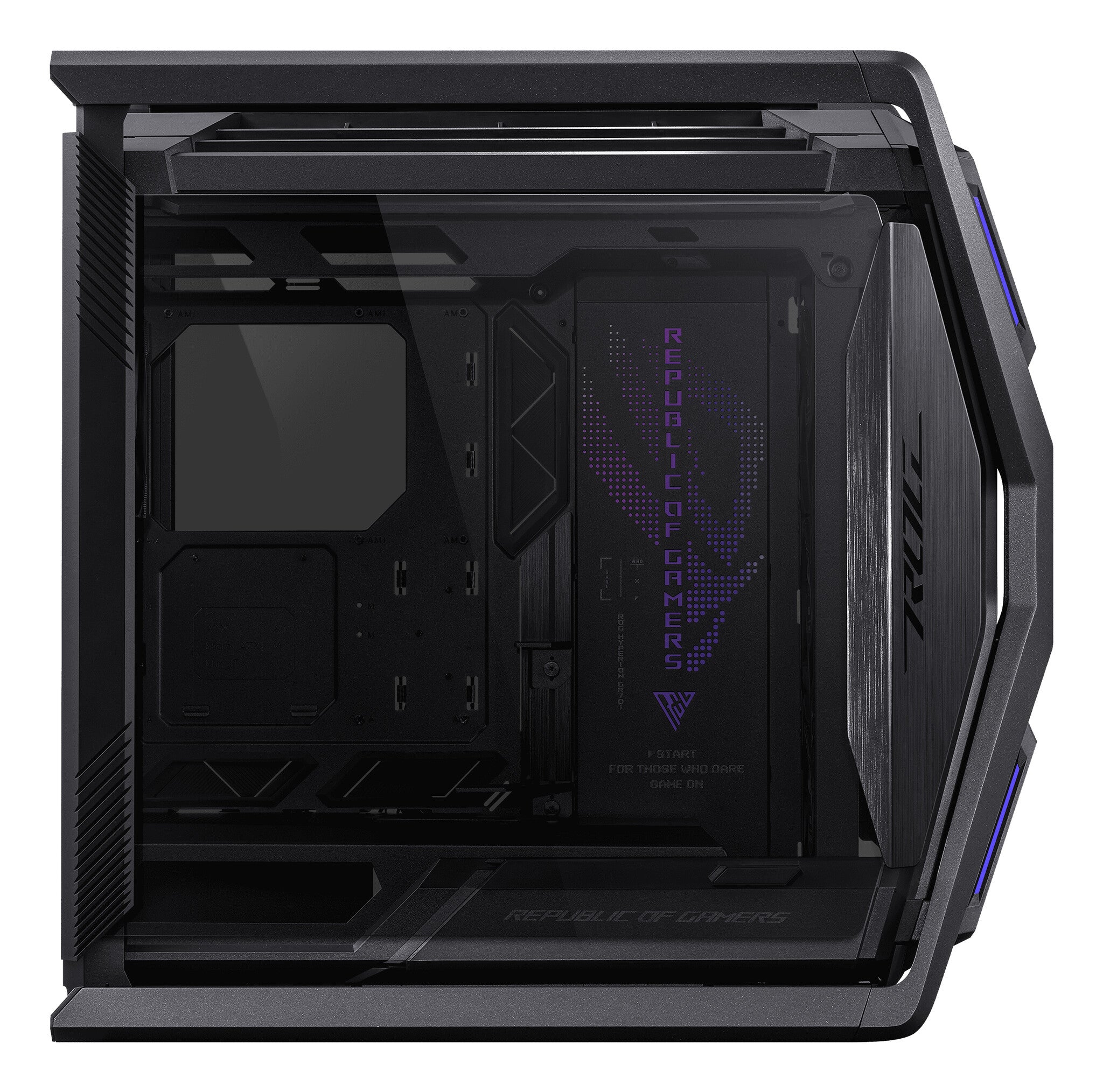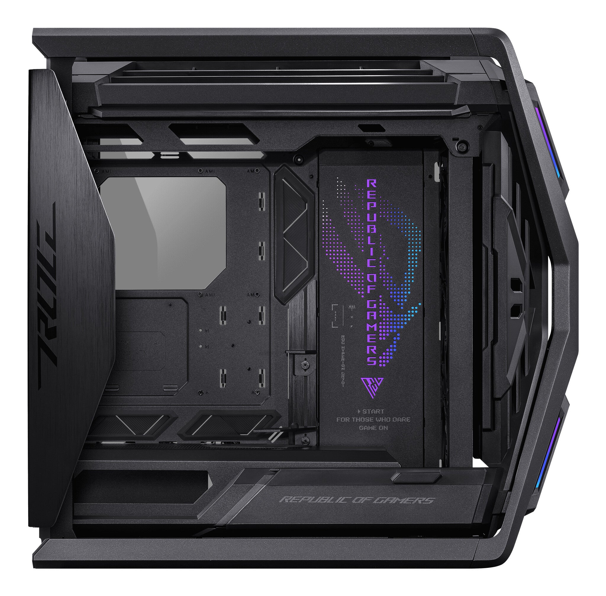The ROG Hyperion GR701 BTF Edition brings an X factor in both form and function that builders around the world have been craving. With support for dual 420 mm radiators, towering video cards, a fully integrated 2-way aluminum graphics card holder, 60-watt device charging and dual front USB-C connectors for compatible ROG motherboards, it is truly a PC chassis in the coveted ROG style.