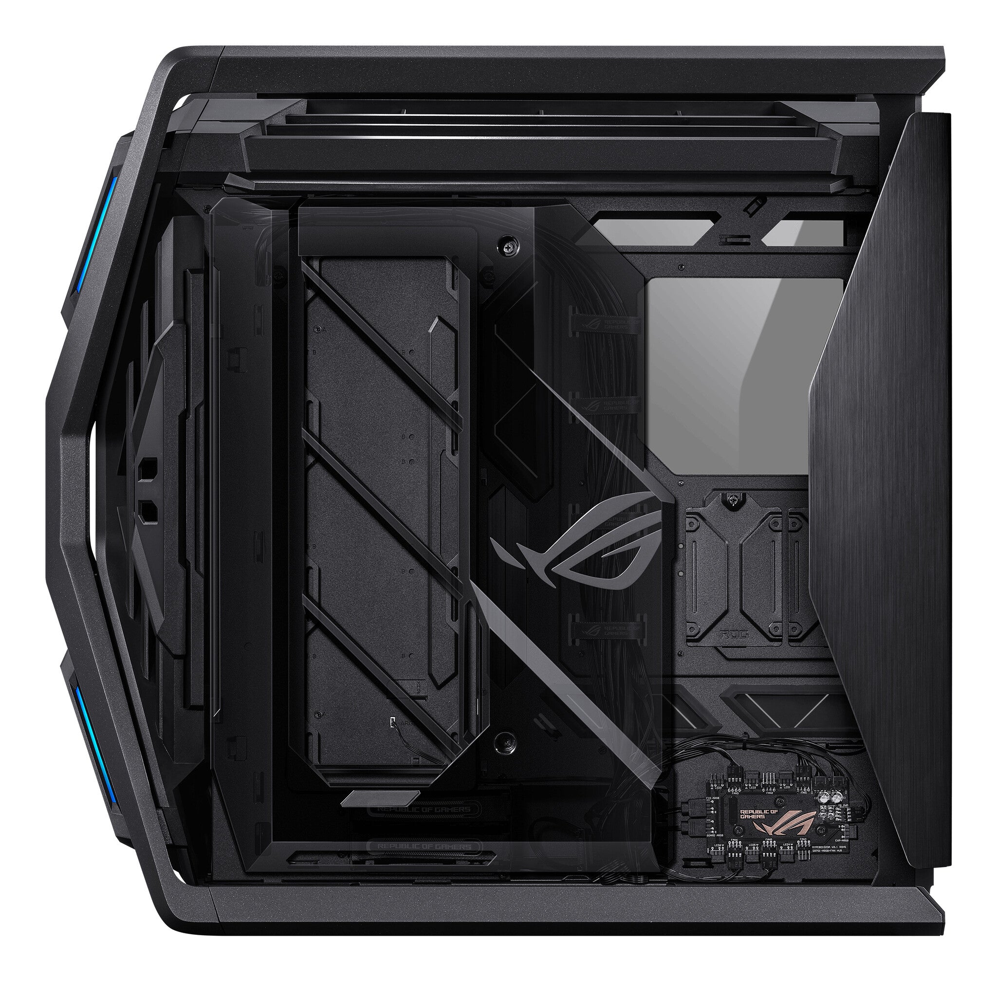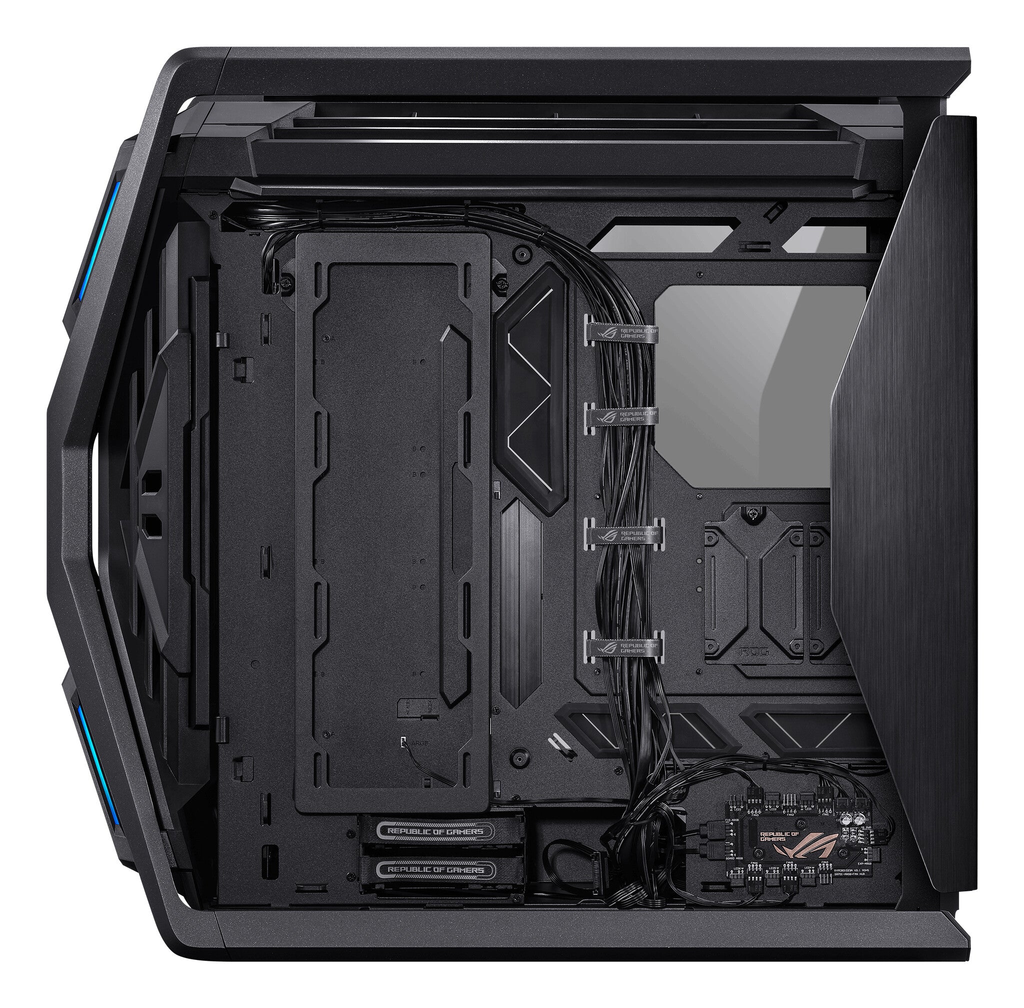 ROG Hyperion GR701 BTF Edition E-ATX computer case, motherboard hidden connectors design support, 420 mm dual radiator support, four 140 mm fans, metal GPU holder, component storage, ARGB fan hub, 60W fast charging.