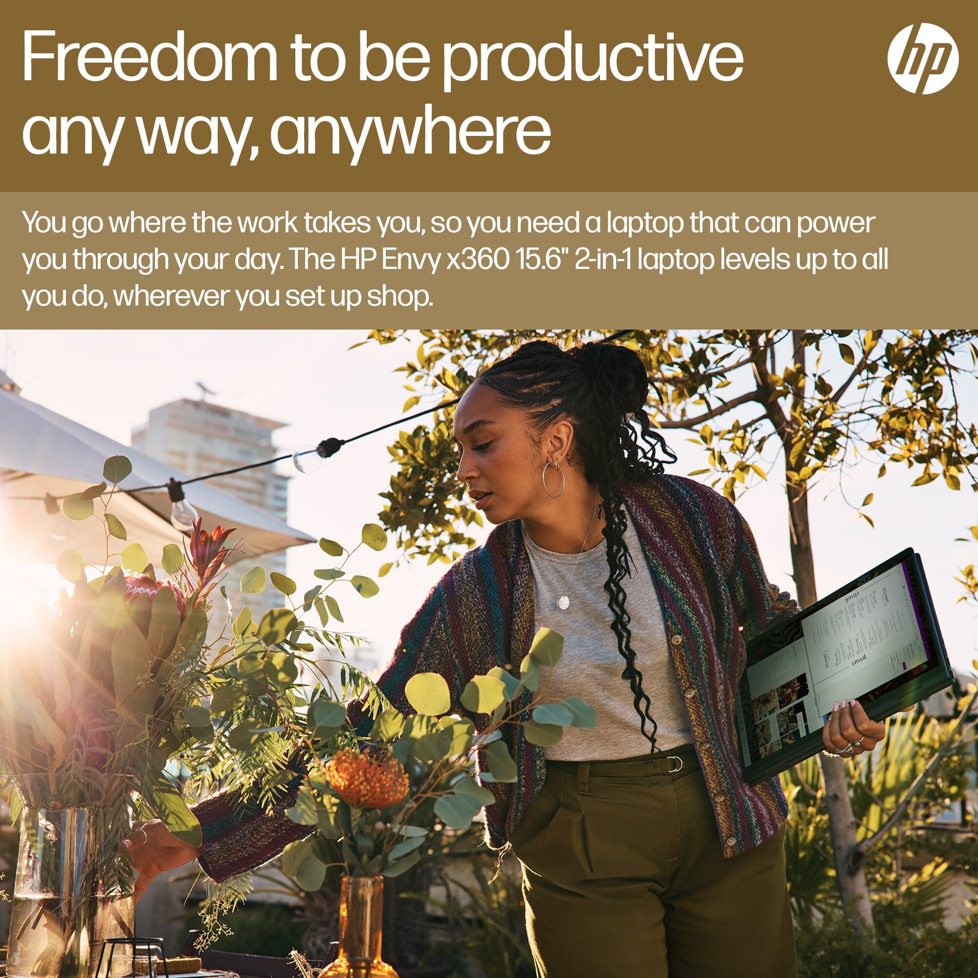 The HP Envy x360 2-in-1 Laptop PC levels up your work or downtime in every possible way, with an enhanced responsive touchscreen, amazing audio, and advanced collaboration technology—all backed a design with recycled materials, serious power, plus all the apps and security features you need for an unstoppable you.