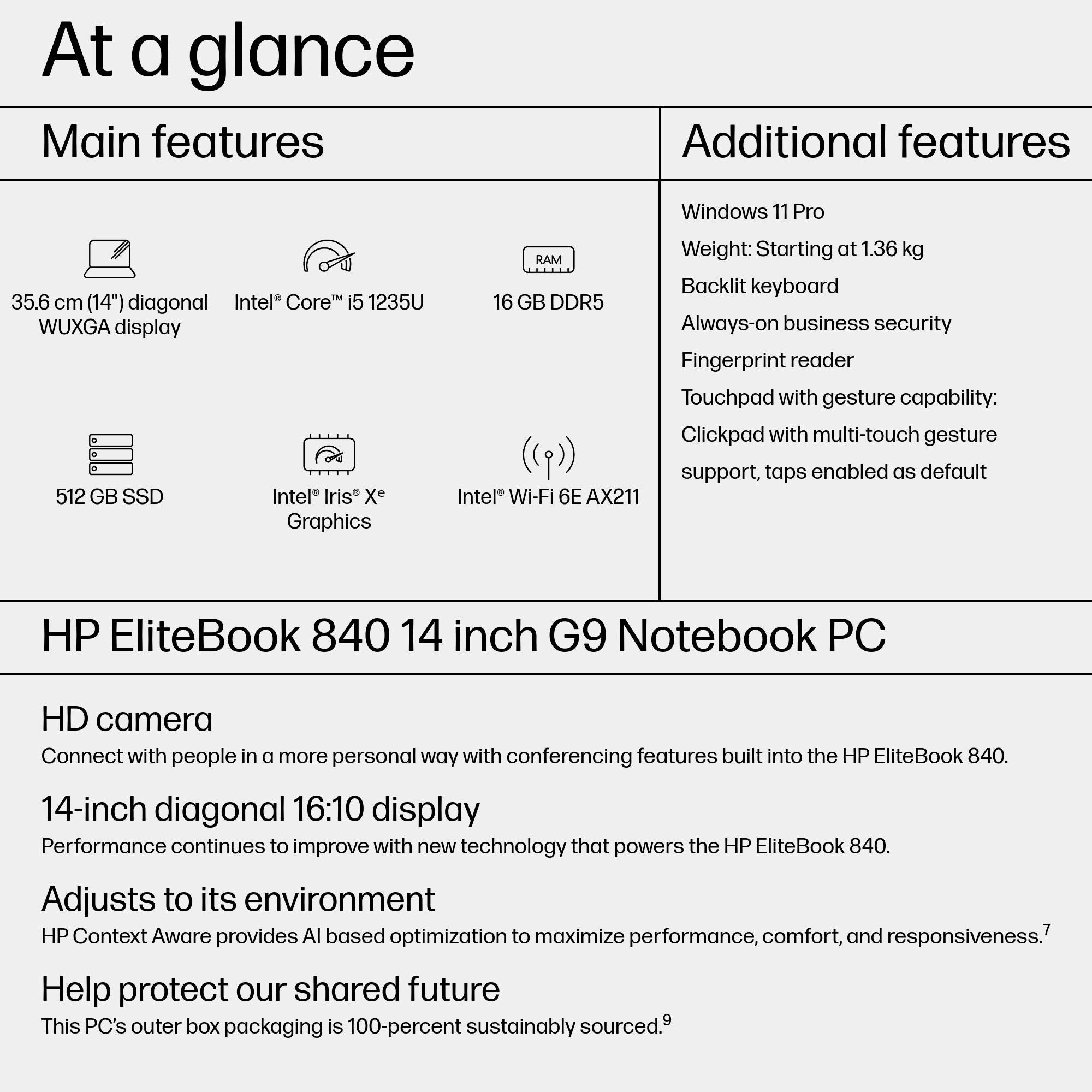 HP EliteBook 840 14 G9 Intel® Core™ i5 i5-1235U Laptop 35.6 cm (14") WUXGA 16 GB DDR5-SDRAM 512 GB SSD Wi-Fi 6E (802.11ax) Windows 11 Pro Silver
