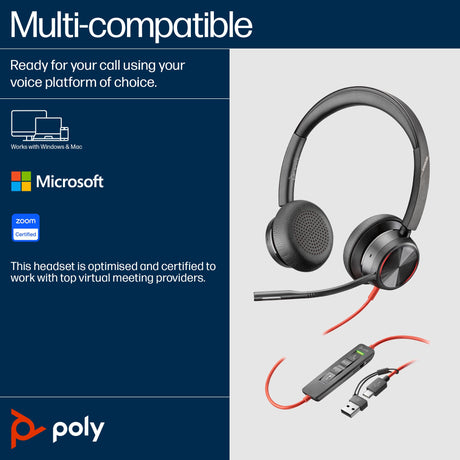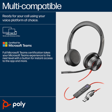 POLY Blackwire 8225 Stereo Microsoft Teams Certified USB-C Headset +USB-C/A Adapter