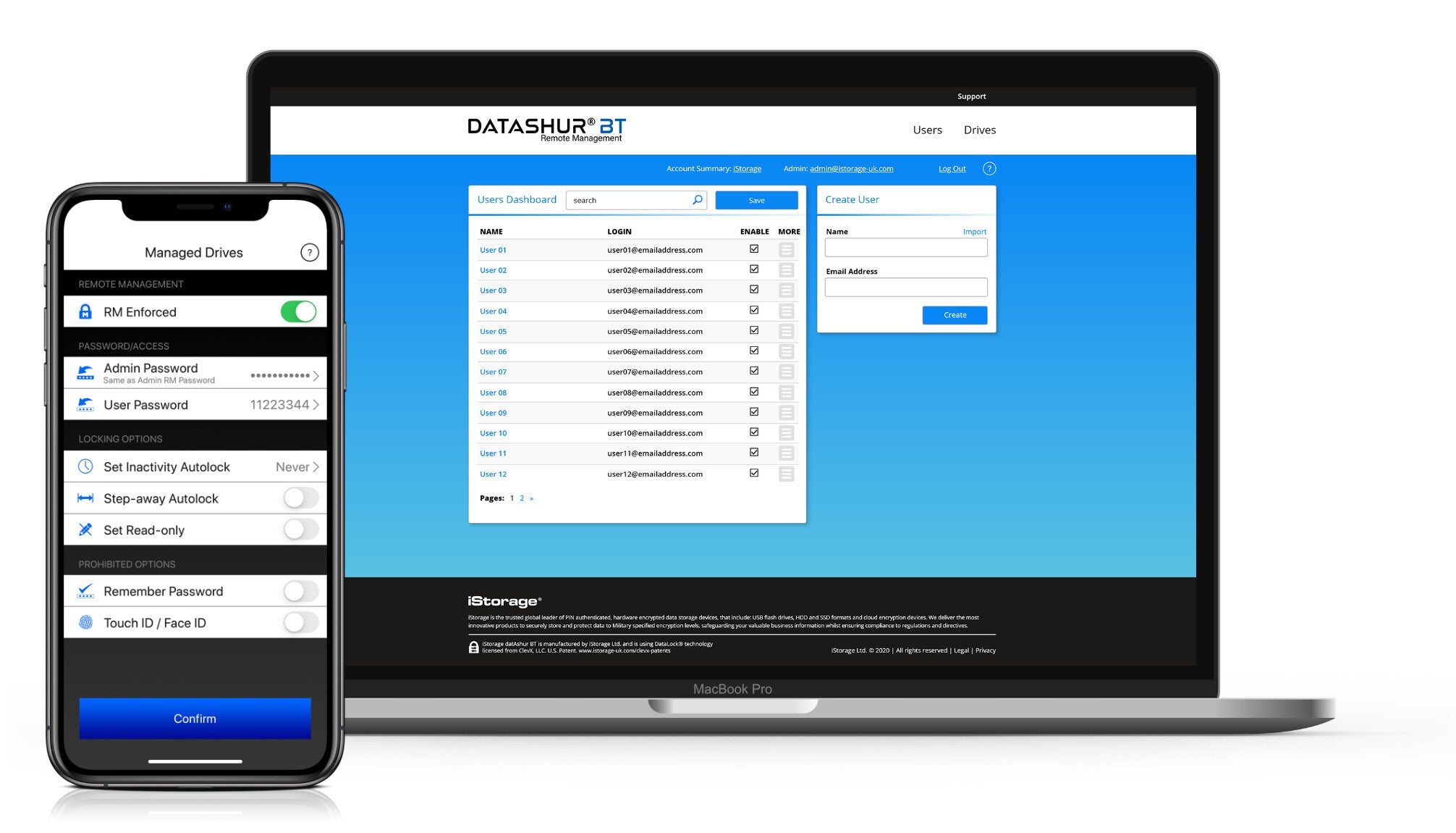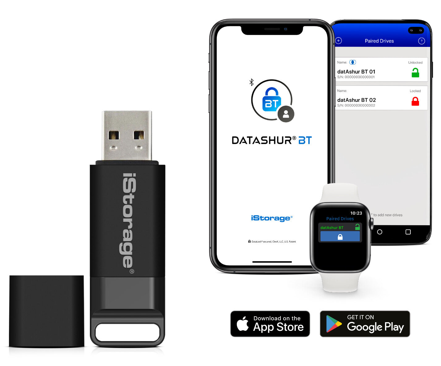 The iStorage datAshur BT is an ultra-secure, hardware encrypted USB 3.2 (Gen 1) flash drive that is available in capacities from 4GB-128GB¹. datAshur BT offers multi-factor smartphone (Android and iOS) secure wireless user-authentication via an encrypted Bluetooth® channel between the phone and the drive. Users can authenticate the datAshur BT Flash Drive by entering a 7-15-character password or simply use Biometric unlock (Face ID/Facial recognition, Touch ID/Fingerprint and IRIS Scanning) via their smartphone.