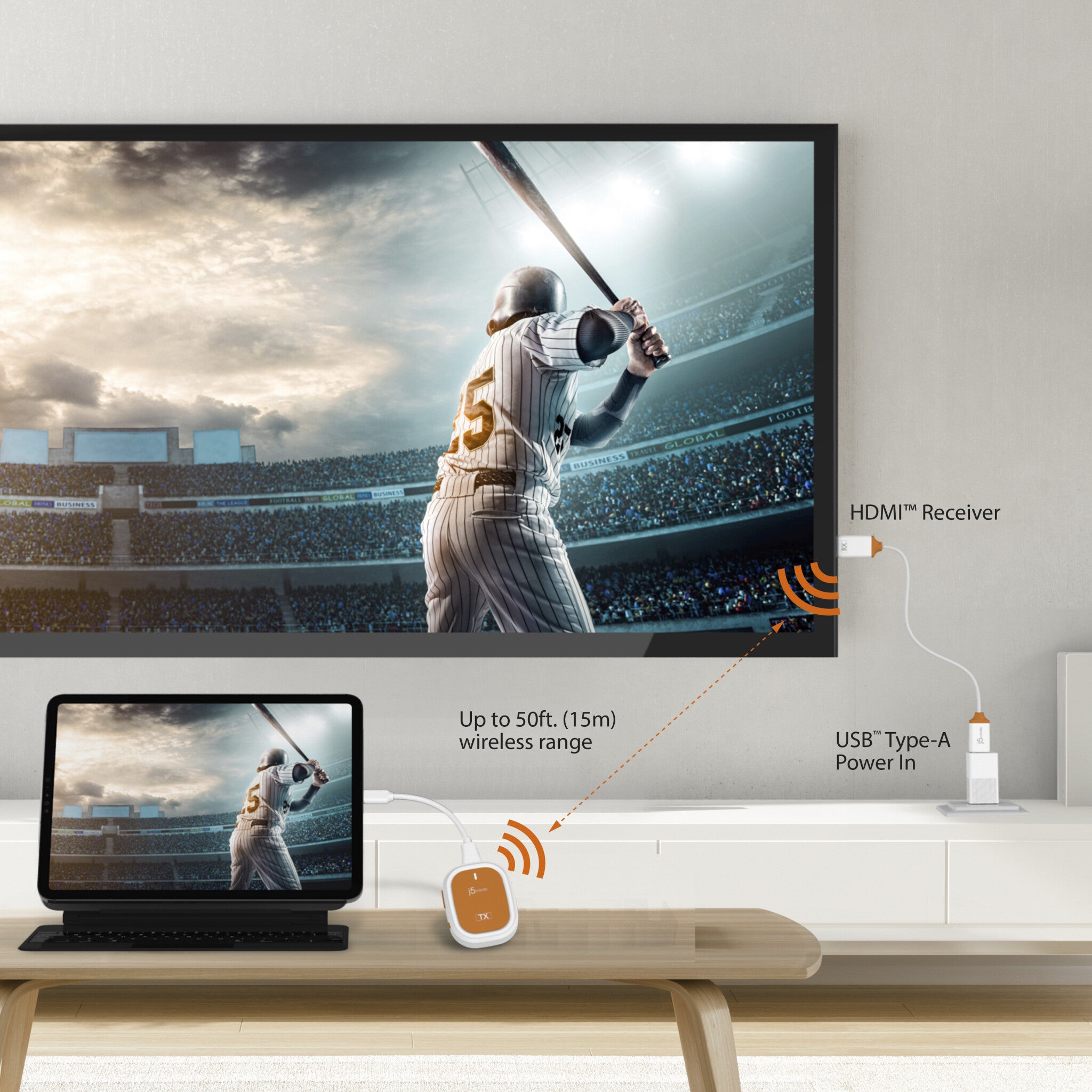 Eliminate the need for expensive cables by wirelessly sending what’s on your laptop, tablet, or mobile phone to your HDTV with this HDMI™ Extender. The JVAW61 transmits audio and video from a USB-C® device to an HDMI™ TV, projector, or monitor, creating a dedicated audio and video connection without the hassle of needing to connect to a network. Enjoy a larger screen by simply connecting the transmitter to your compatible mobile device and the receiver to your TV.