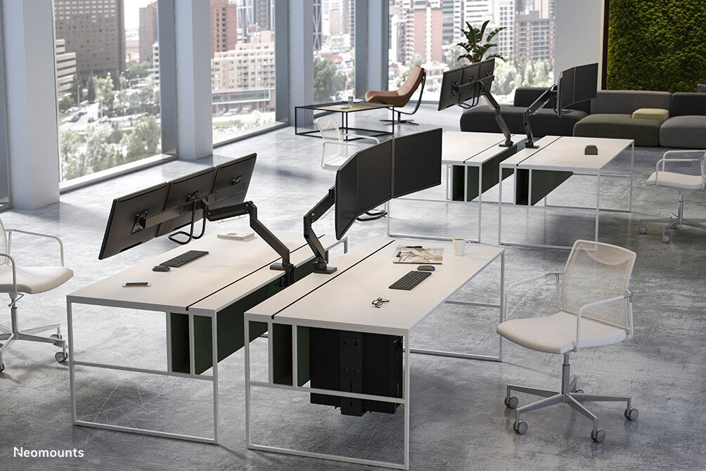 The Neomounts NM-D775DX3BLACK is a tilt-, swivel and rotatable desk mount with crossbar and handle for three flat screens up to 27". This mount is a great choice for space saving placement on desks using a desk clamp or grommet mount.