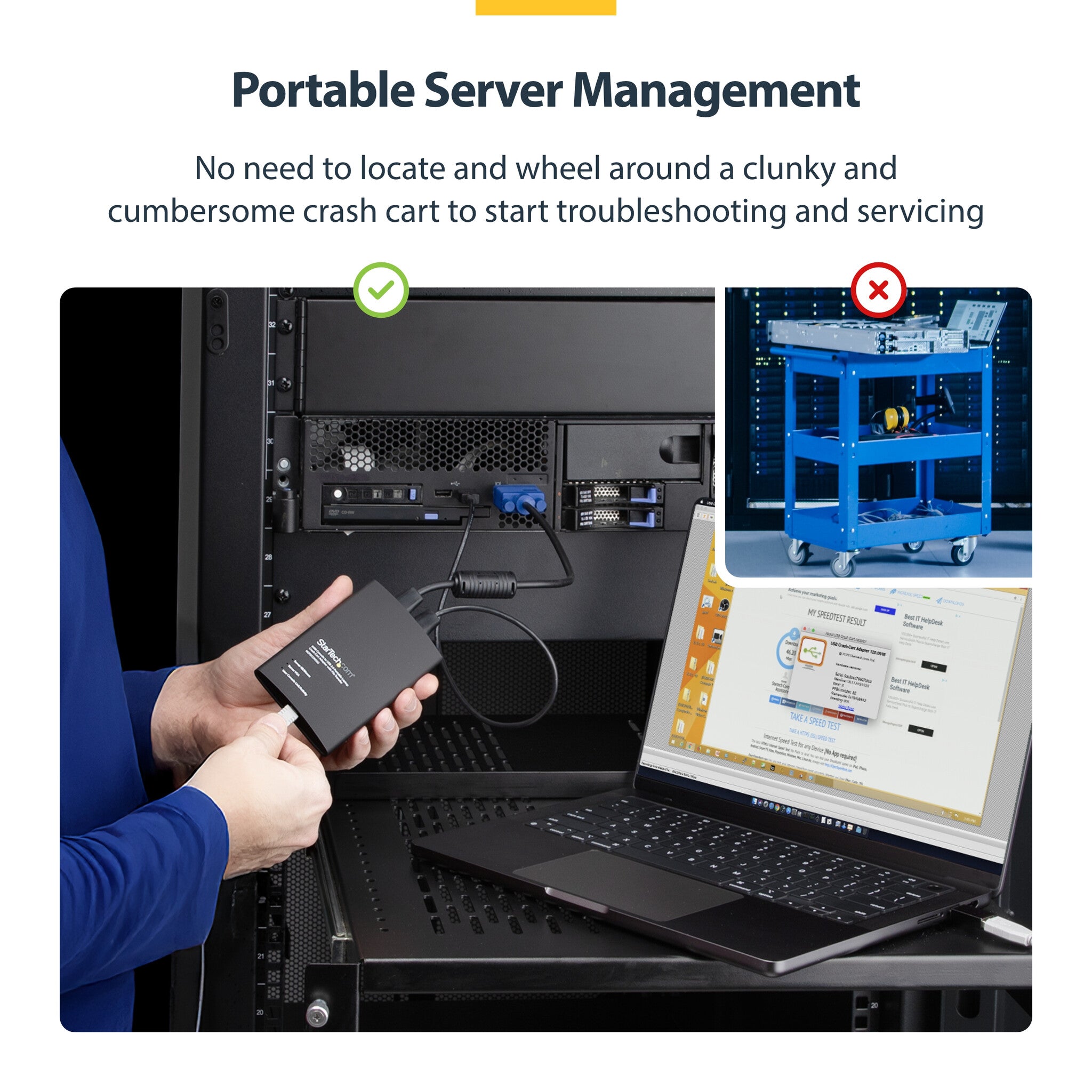 This pocket-sized adapter features a compact design that easily fits inside your laptop bag and requires no additional accessories to connect, eliminating the need to lug around a large, awkward traditional crash cart to troubleshoot and service your systems.