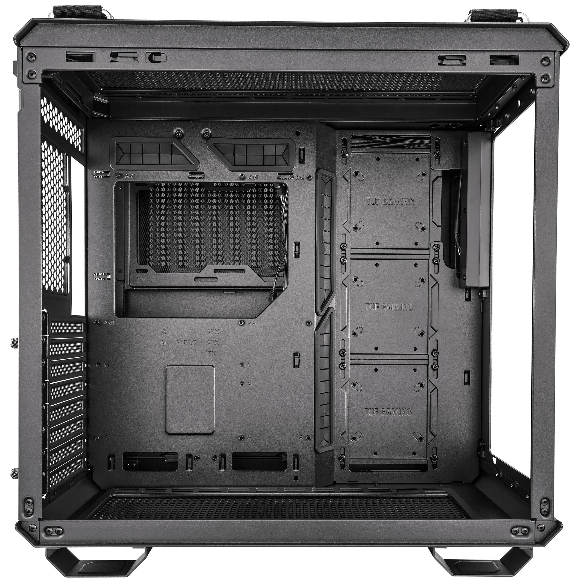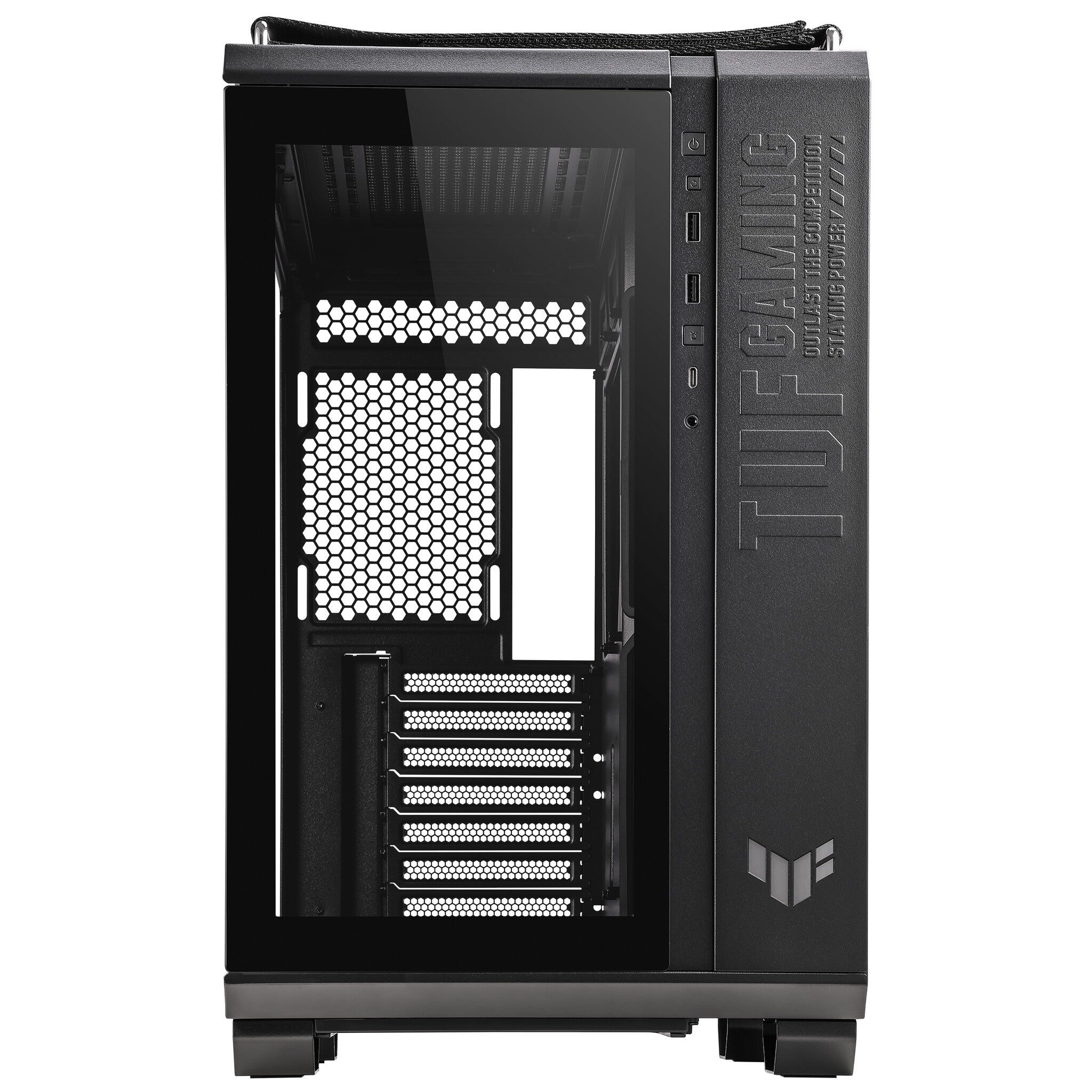 Asus TUF Gaming GT502 Boîtier avec fenêtre avant et latérale en verre, ATX, double chambre, conception modulaire, bouton de commande LED, USB-C, poignées de transport, noir