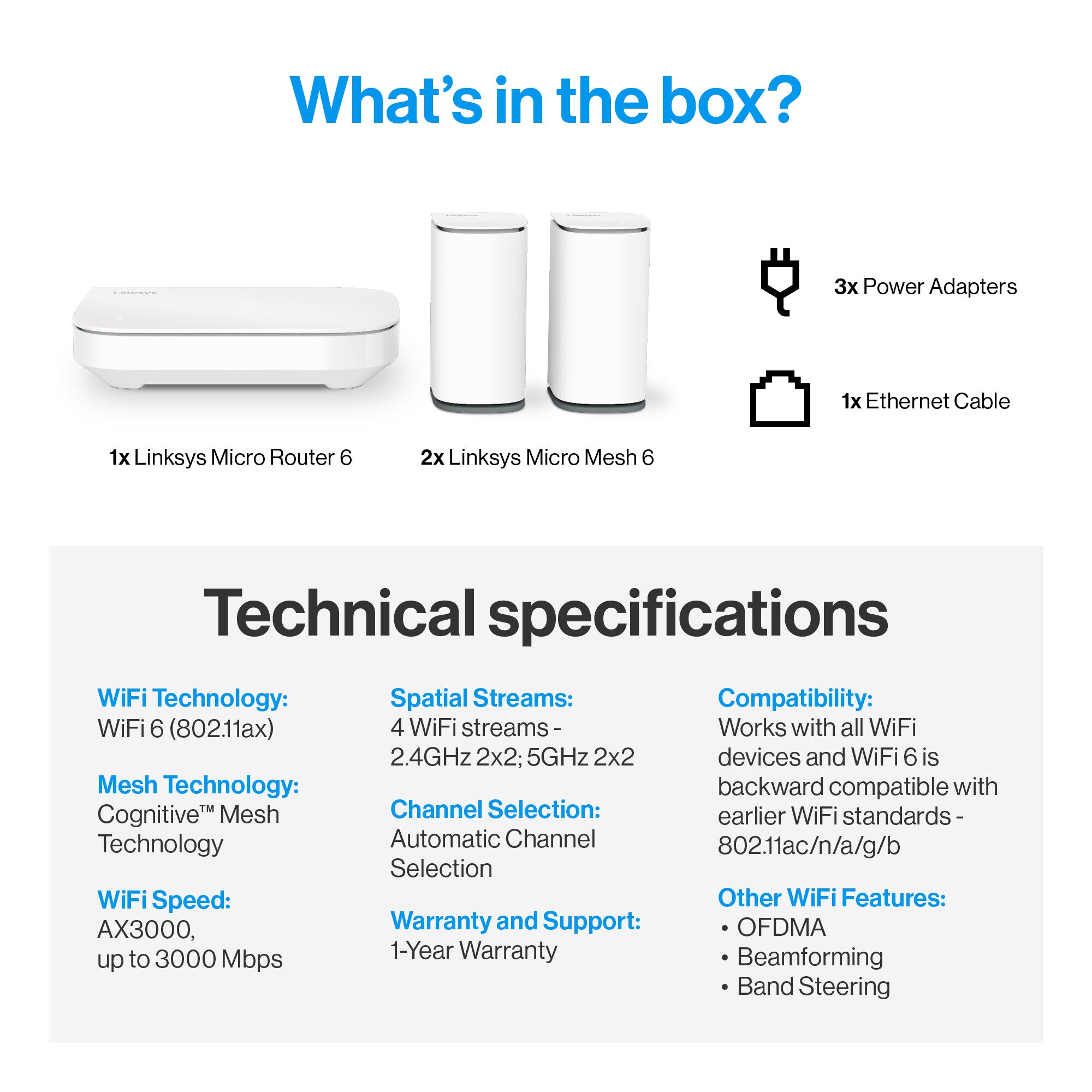 Linksys Velop Micro 6 Mesh System AX3000, WiFi 6, 2.4 GHz + 5 GHz, 1x 2.5 Gigabit WAN, 4x Gigabit LAN, 512MB, 3-Pack