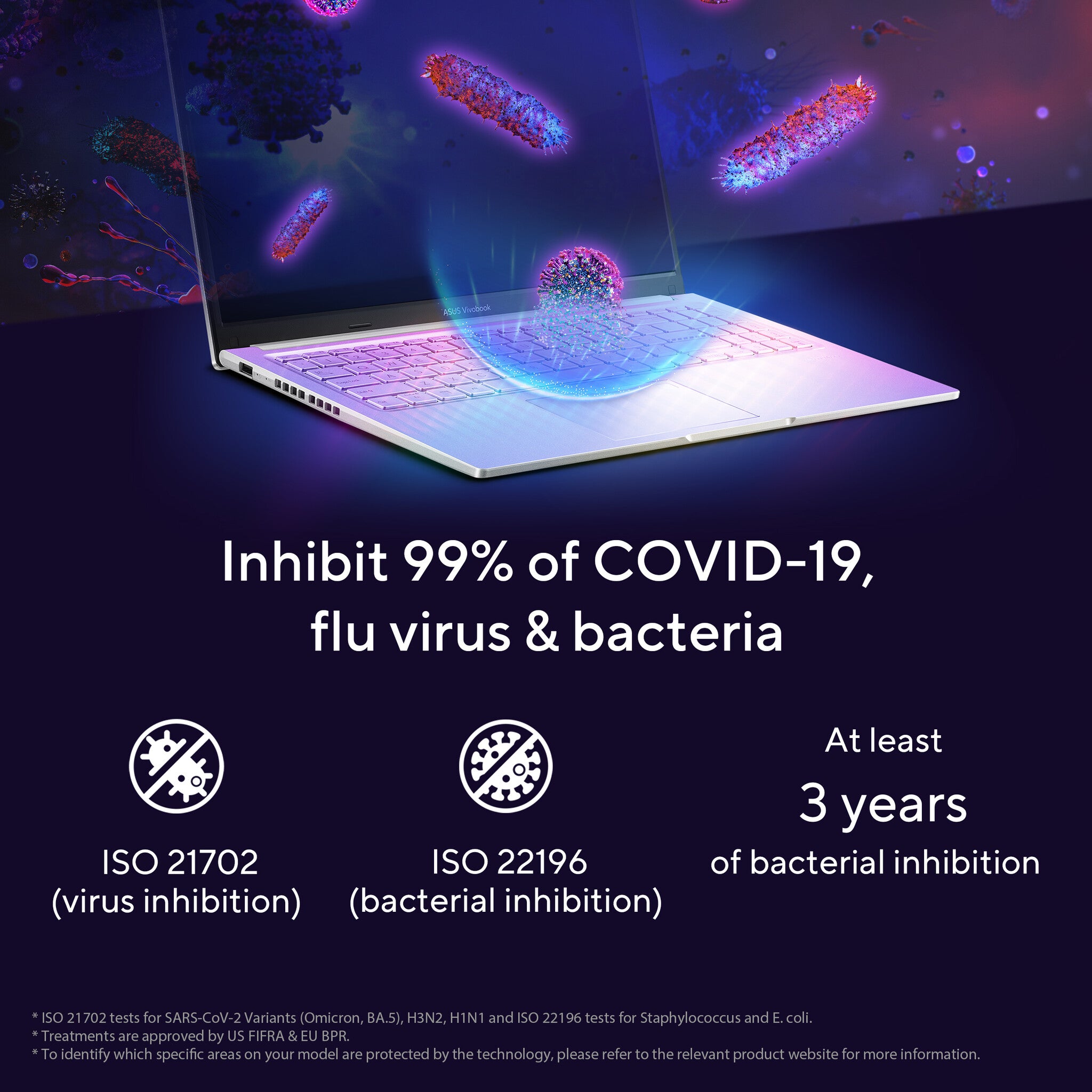 ASUS Antimicrobial Guard Plus is applied to frequently touched areas of your laptop to help keep it hygienic. This technology uses a denser treatment* that inhibits viruses and bacteria. And it is scientifically shown — using the ISO 2170210 and 2219611 standards — to inhibit virus and bacteria growth by more than 99% over a 24-hour period4. Strains used for the tests include the SARS-CoV-2 (COVID-19), H3N2 (Influenza A) and the E. coli bacterium12.