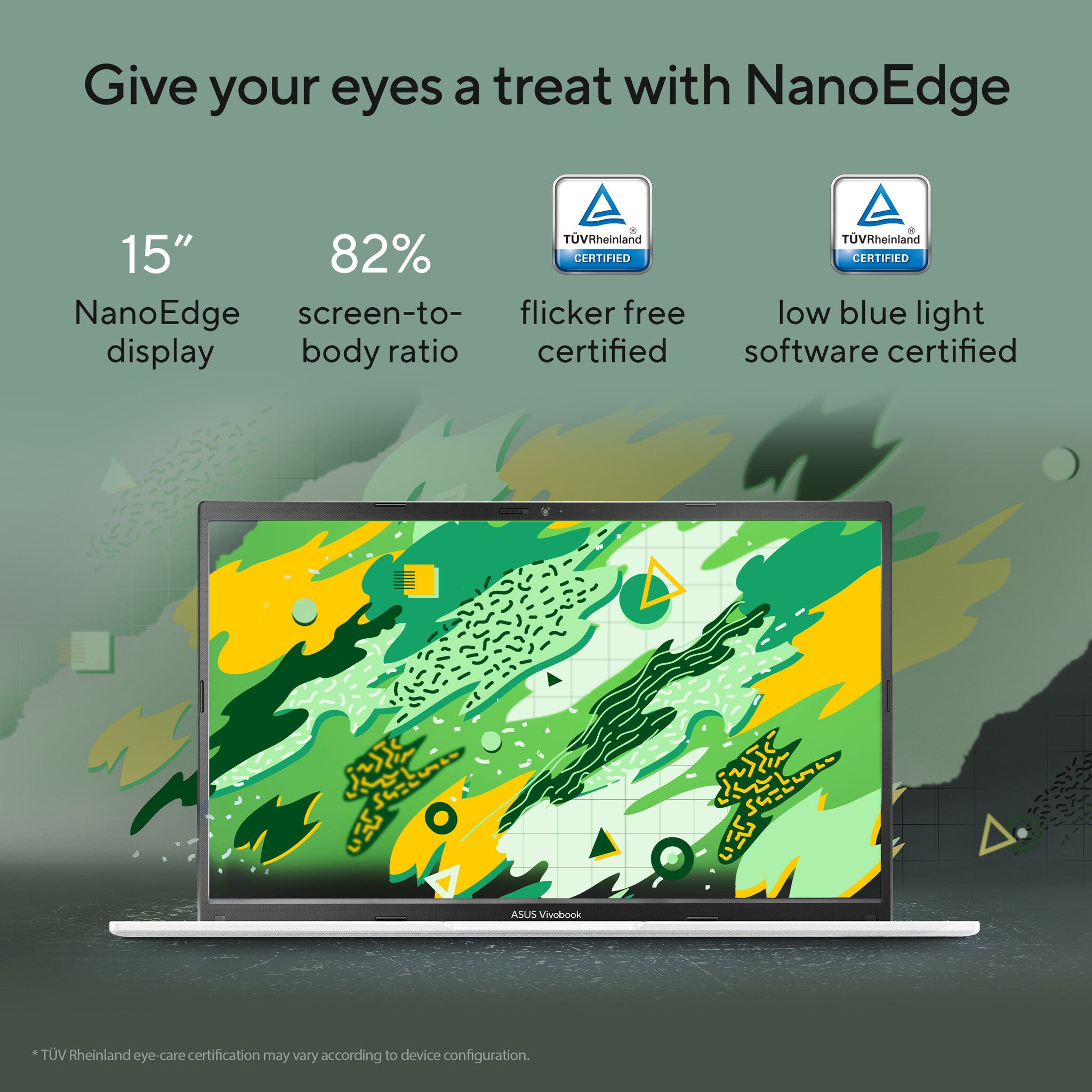 Give your eyes a treat with Vivobook 15’s clear, slim-bezel NanoEdge display (also available as an optional touchscreen). It has wide viewing angles, and is TÜV Rheinland-certified for low blue-light levels, reducing the risk of eye strain during marathon viewing sessions.