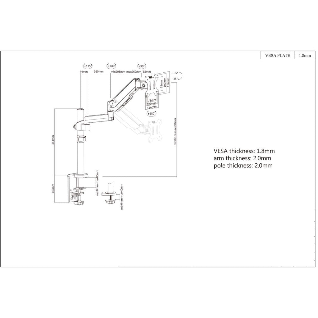 The Manhattan Universal Gas Spring Monitor Mount securely supports one 17" to 32" TV or monitor. Because it uses a gas spring to hold your display, its arm only needs the lightest touch to move your screen to the best viewing angle for you. The mount's high-quality aluminium and steel construction will provide years of reliable service. Ideal for installation on a large desk, the Manhattan Universal Gas Spring Monitor Mount lets you take advantage of the extra range of movement so you can have more space to get work done.