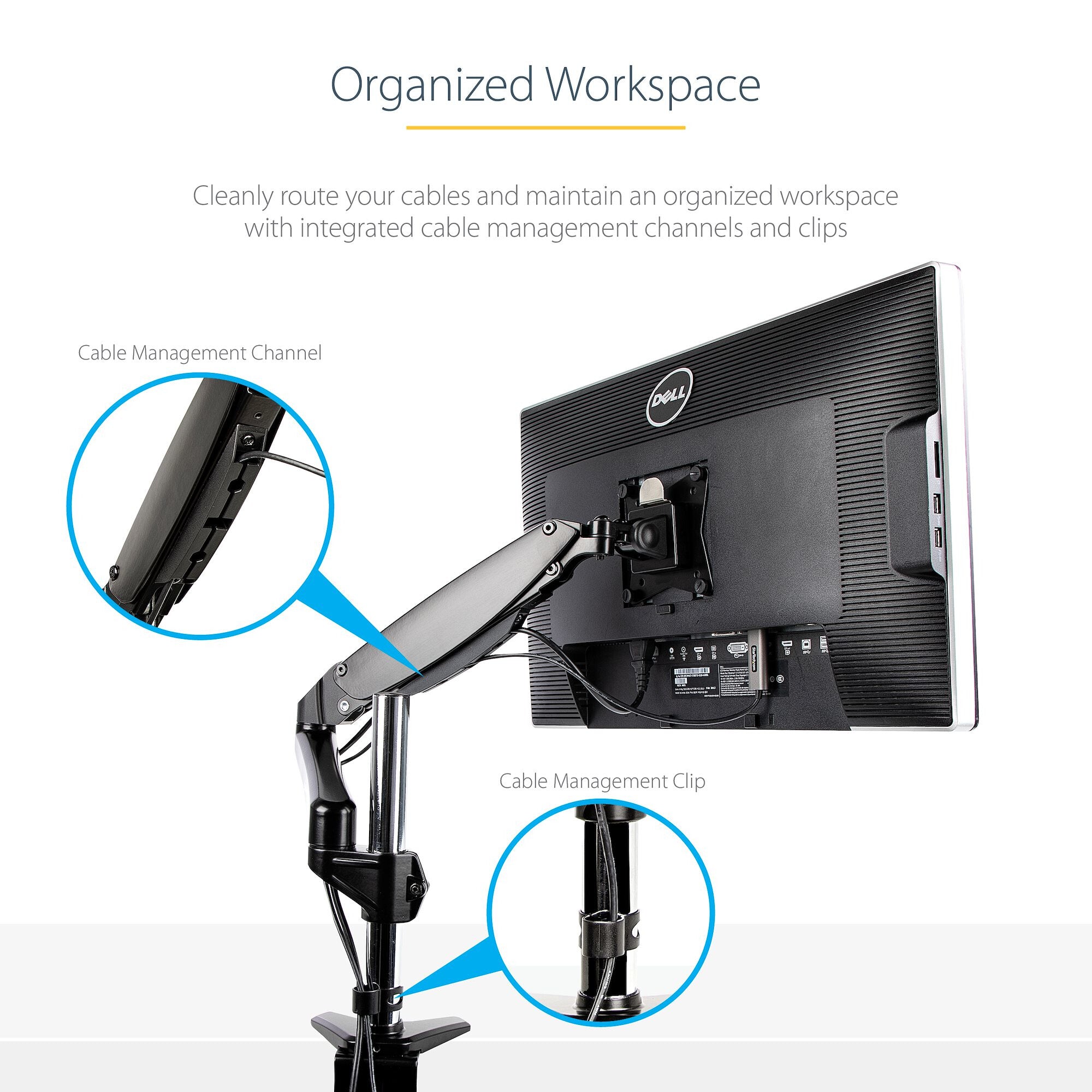 This single desk monitor arm enables you to free up space by letting you mount your monitor to your desk, table, or countertop. In addition, it features integrated cable management channels along the arm, and cable management clips to route your cables and maintain an organized and professional look on your workstation.