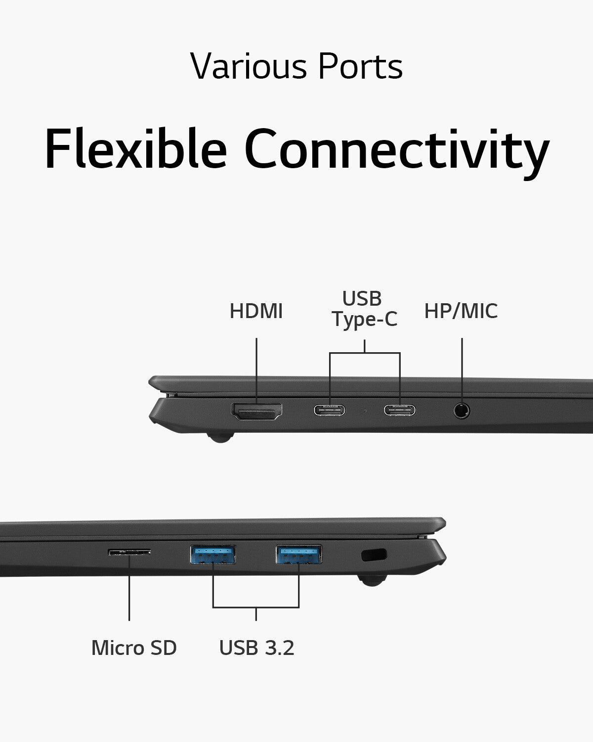 LG gram offers not only various ports but also two Thunderbolt™ 4 for ultimate scalability. Experience 5k display at a 40 GB transfer speed while charging external devices simultaneously.