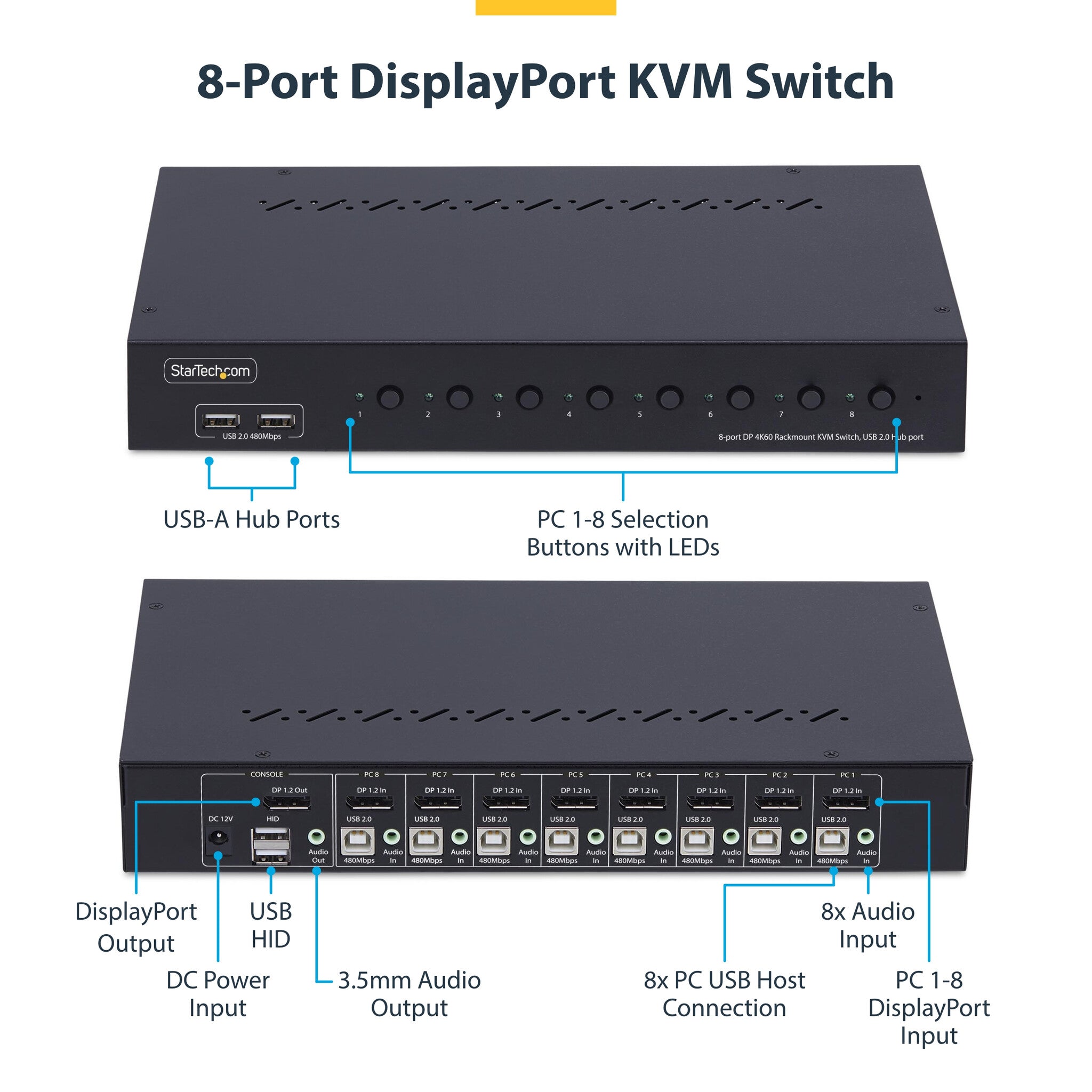 StarTech.com 8-Port DisplayPort KVM Switch with 1U Rack Mount Kit, 4K 60Hz DP 1.2, Push-Button & Hotkey Switching, 4-Port USB Hub, OS Independent, TAA Compliant