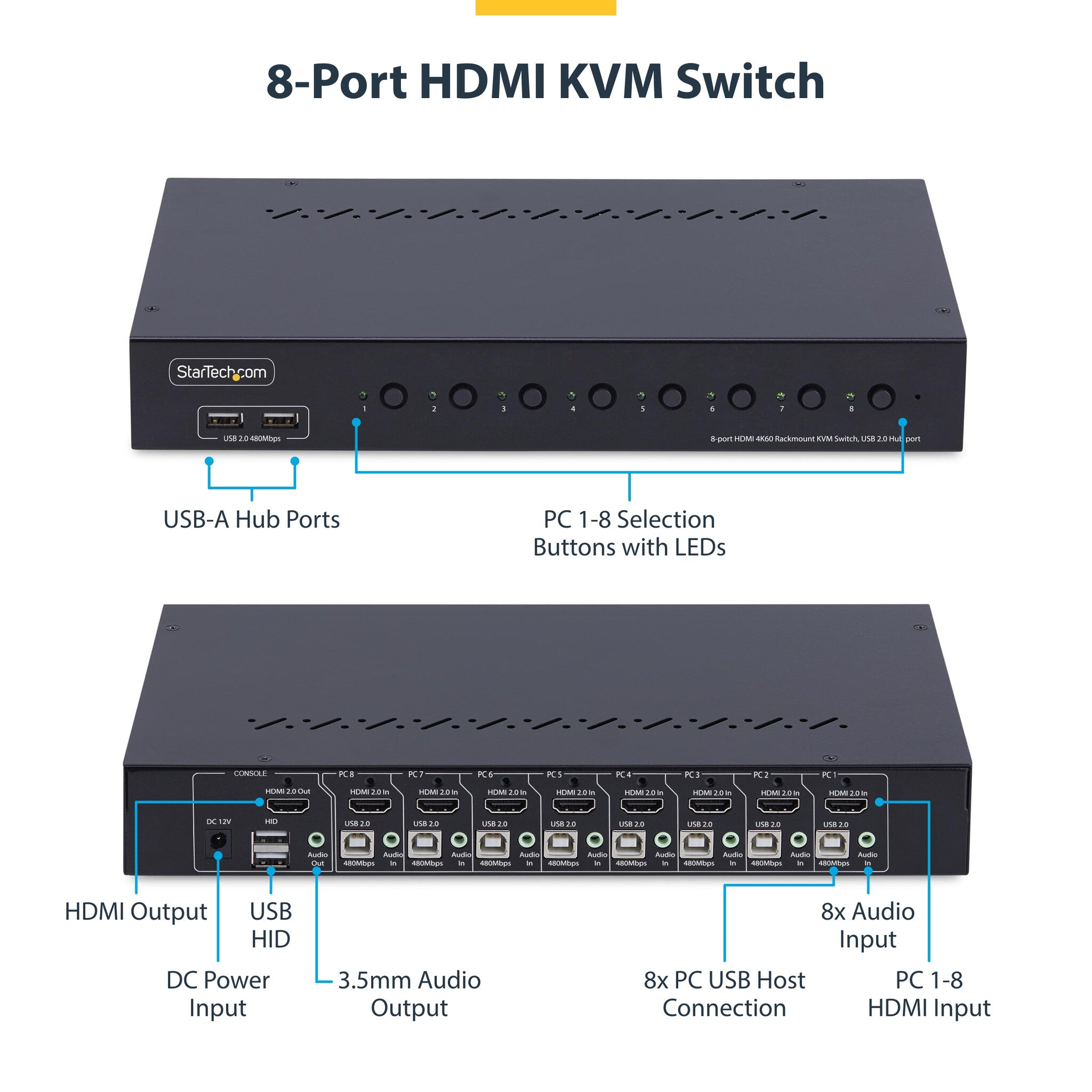 StarTech.com 8-Port HDMI KVM Switch with 1U Rack Mount Kit, 4K 60Hz HDMI 2.0, Push-Button & Hotkey Switching, 4-Port USB Hub, OS Independent, TAA Compliant