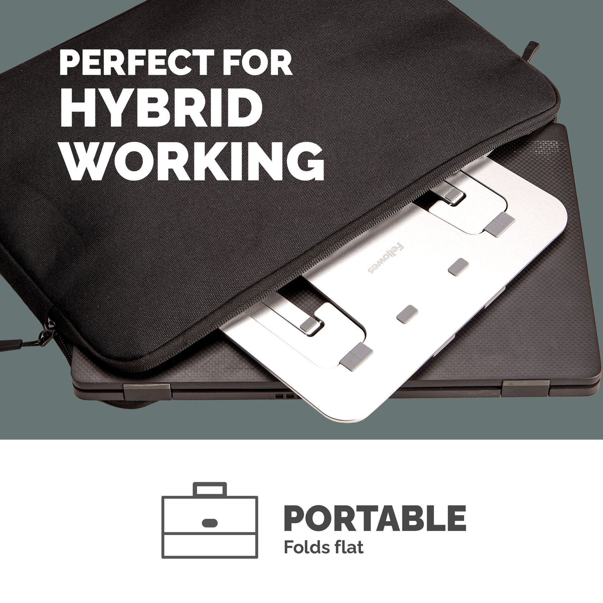 The Fellowes Alumia Portable Laptop Stand is designed to help minimise discomfort in your workspace by elevating your laptop to a more ergonomically correct viewing position, reducing neck and eye strain. It supports laptops up to 5kg in weight and screen sizes up to 15 inches. With six easy-to-use height adjustments ranging from 8.1 to 13 cm, it promotes good posture and all-day comfort. The compact and lightweight design folds flat, making it perfect for storage or on-the-go use - ideal for hybrid working environments. Nonslip pads keep your laptop securely in place, while the open design enhances air circulation to help keep your device cool. The Alumia Portable Laptop Stand is FIRA-accredited, meeting the ergonomic requirements of European Health and Safety legislation (EN ISO 9241-5). This laptop riser comes with a 5-year warranty and access to top quality customer support to help with any queries you may have.