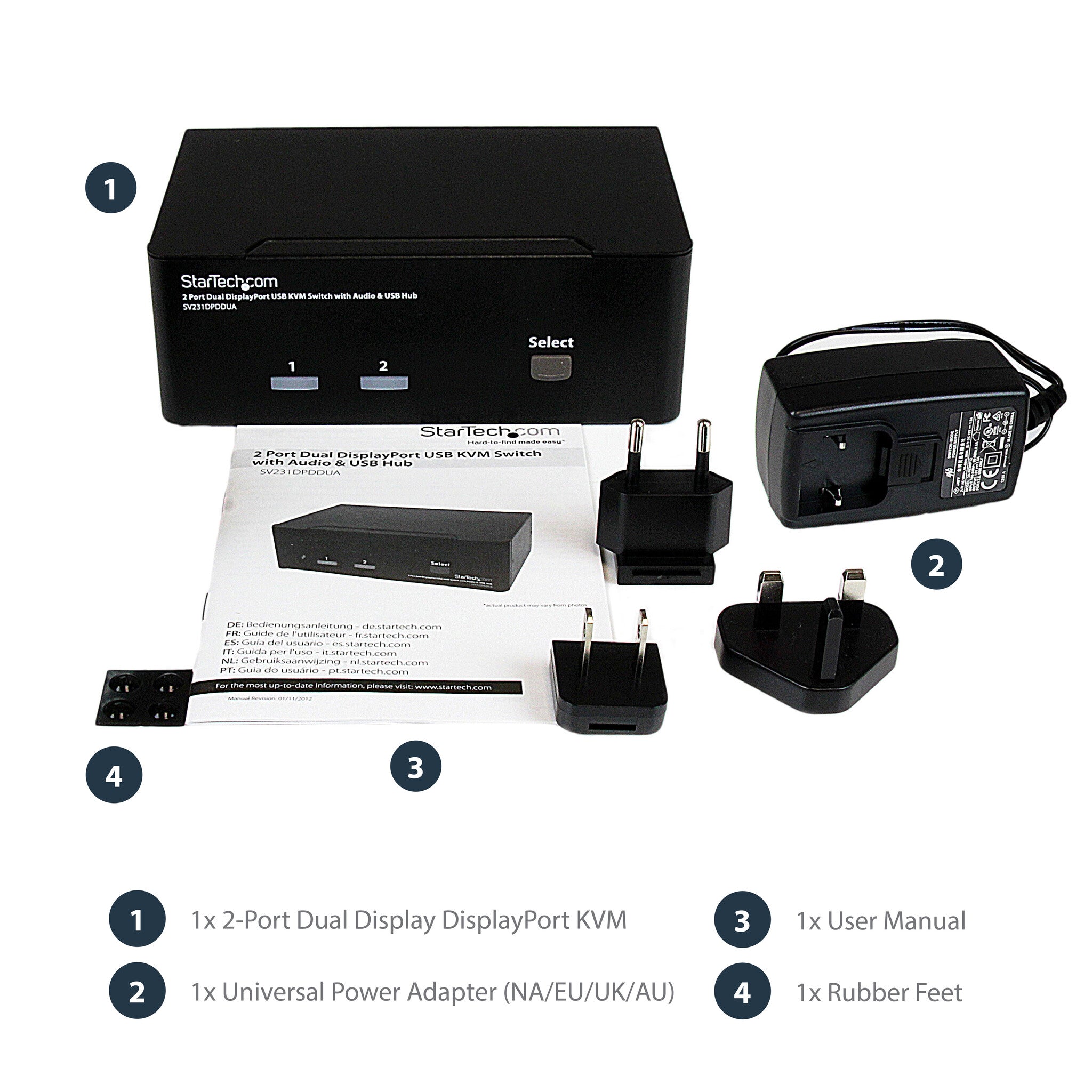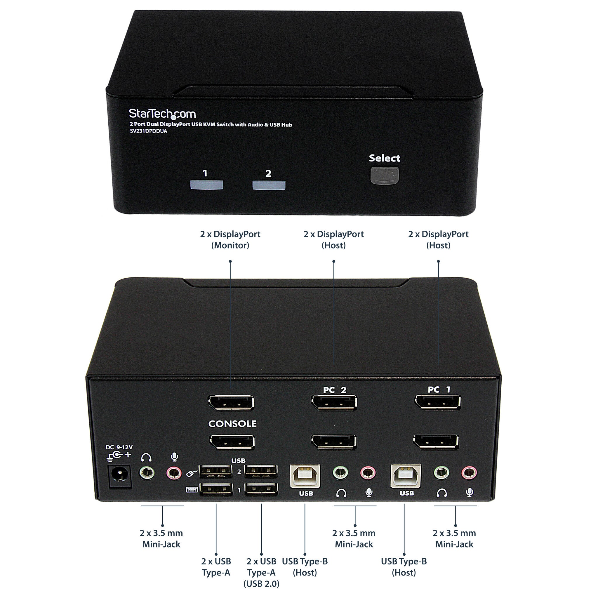 The SV231DPDDUA 2-Port USB Dual DisplayPort KVM Switch with Audio and USB 2.0 Hub combines next generation digital display standards with seamless KVM control, allowing you to switch between 2 dual head or twin DisplayPort systems. Also ideal for systems with a single DisplayPort output, and a second video source such as DVI or HDMI, using a low cost accessory adapter.