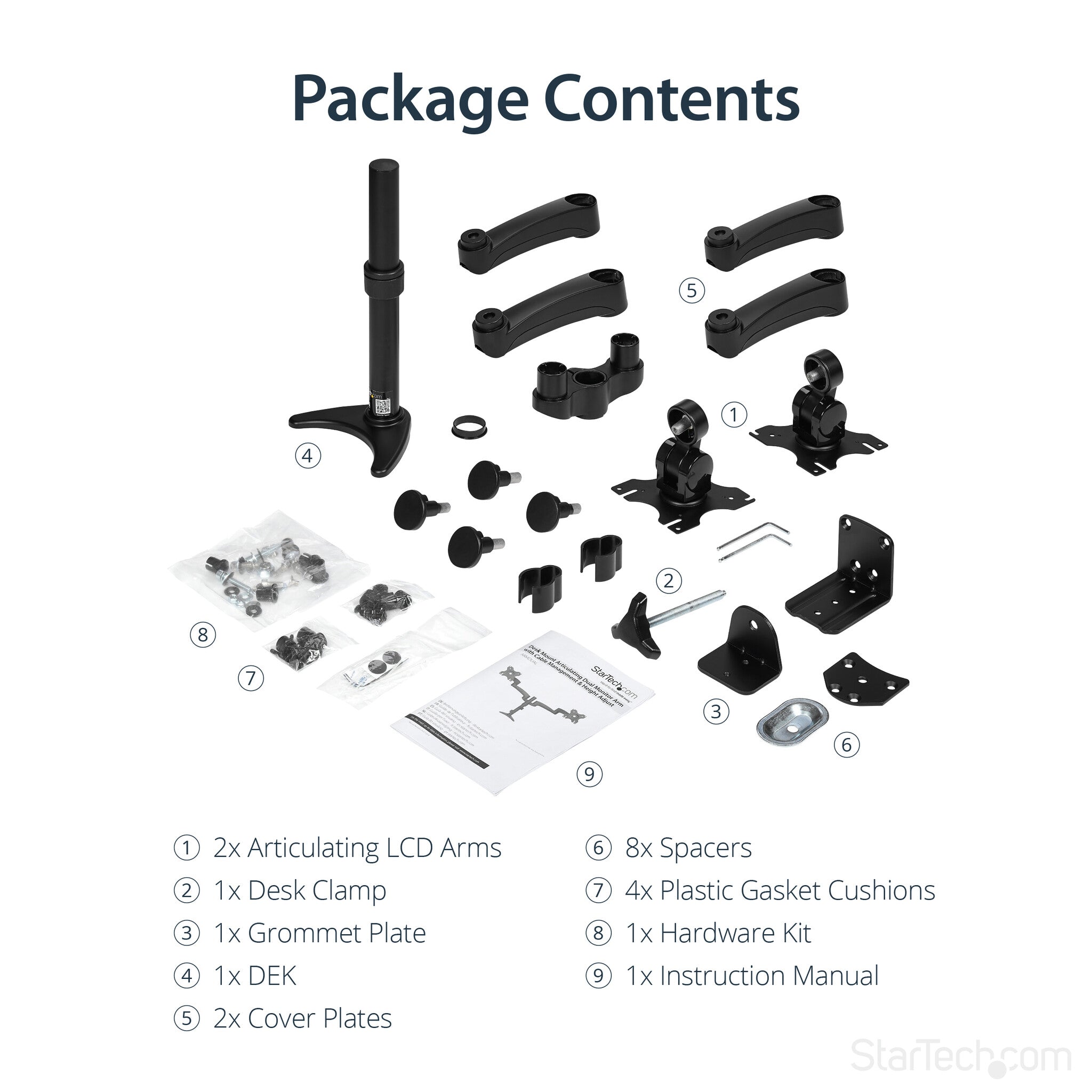 For added installation flexibility, the included mounting hardware can either clamp to the side of your desk / table or mount through a grommet hole, for a versatile dual-monitor mounting solution.