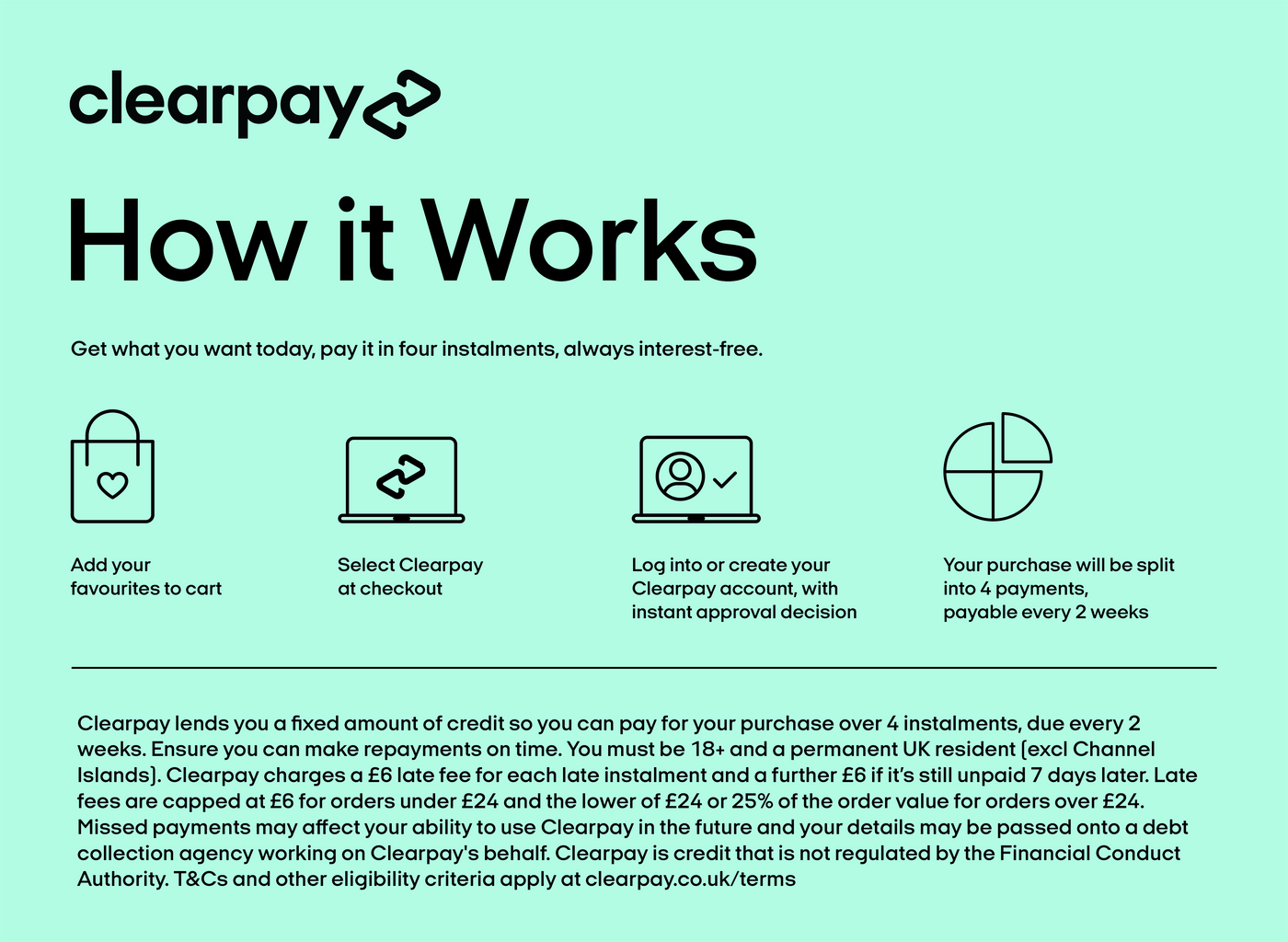 INSTORE: Clearpay is a payment service that lends customers a fixed amount of credit to make purchases instantly and then pay for them in 4 automatic instalments, made every 2 weeks, without any interest (late fees apply). Please use Clearpay responsibly.