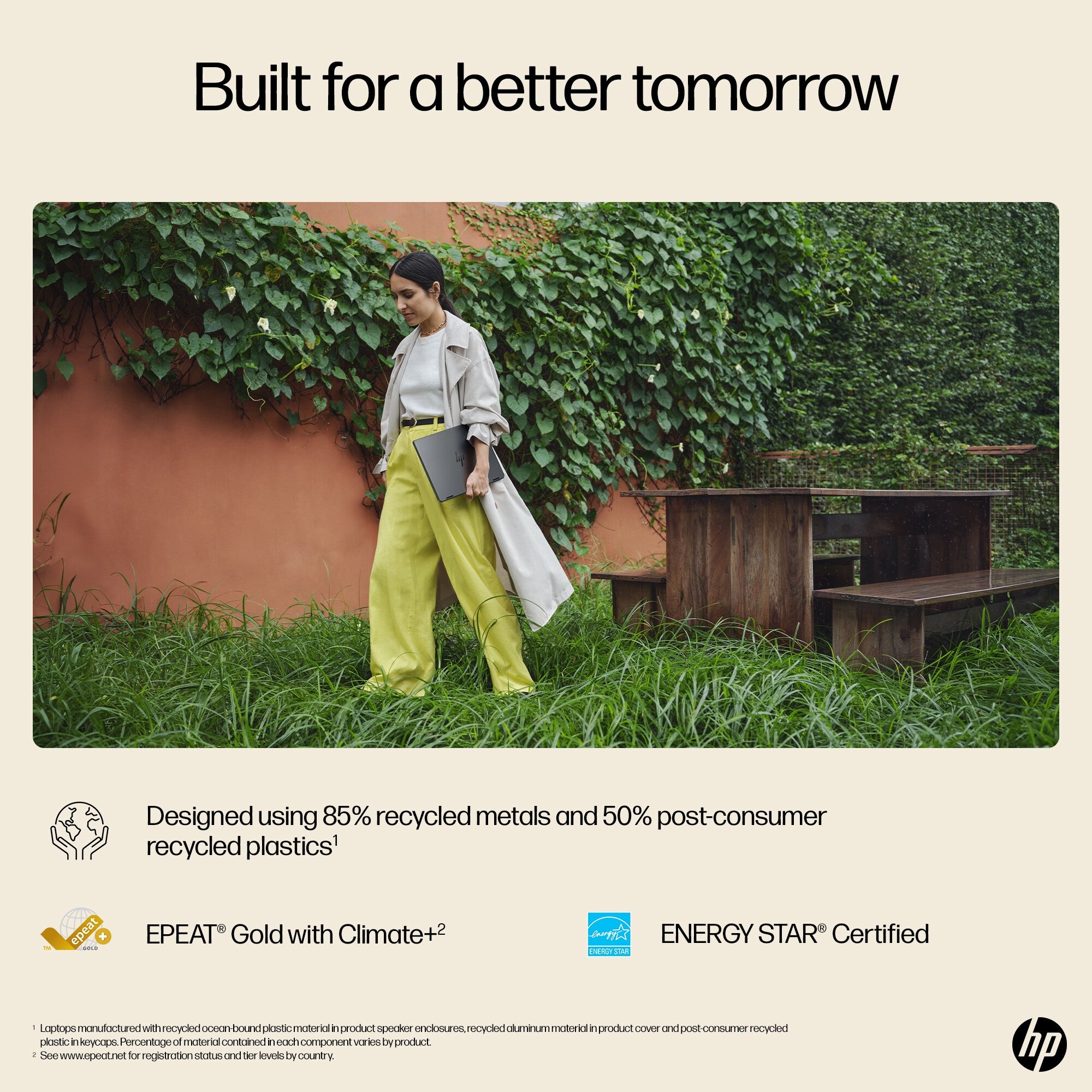 | Sustainable technologies and materials | Ocean-bound plastic in speaker enclosure(s) and bezel; Recycled metal in cover, keyboard frame, base and hinge cap(s); Keyboard keycaps and scissors contain post-consumer recycled plastic |