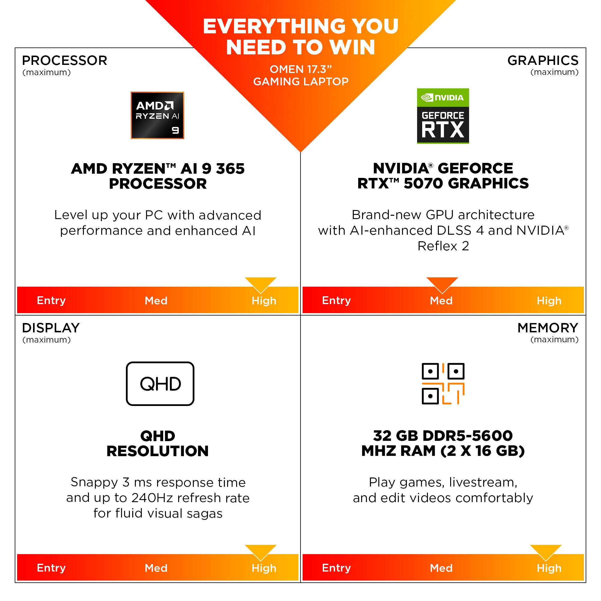 With the new OMEN 17, we didn't waste time loading it with features you'd never use. Instead, with an impressive 17" IPS display with 100% sRGB, new AI-enhanced AMD Ryzen™ AI 300 CPUs and NVIDIA RTX™ 50 Series GPUs, as well as a 1-zone RGB numeric keyboard, it's everything you need for great gaming and nothing you don't.[2,3]