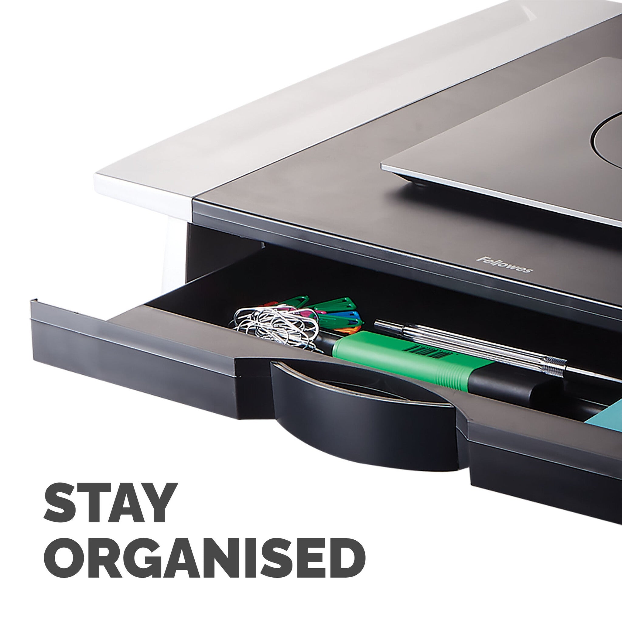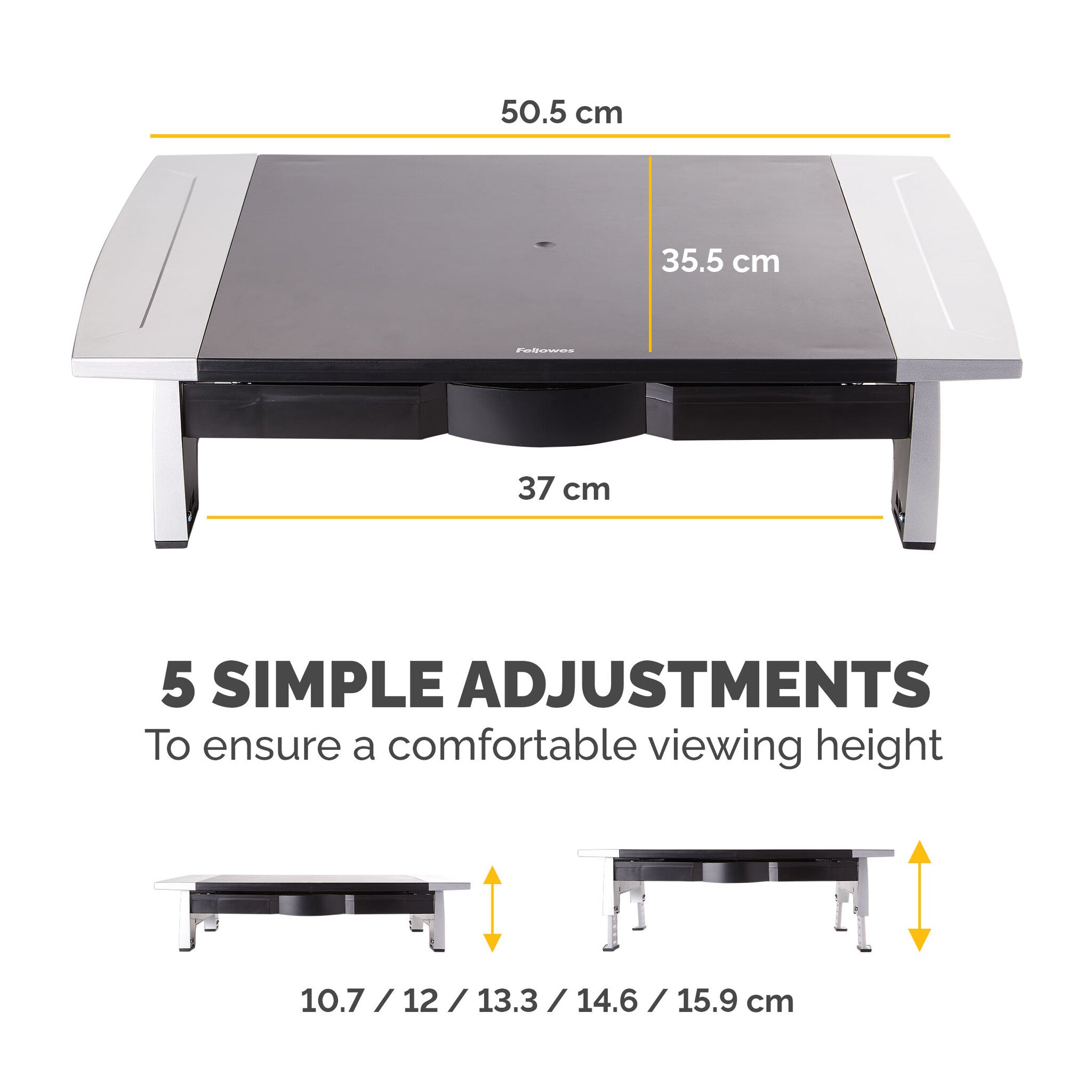 Fellowes Computer Monitor Stand with 5 Height Adjustments - Office Suites Monitor Riser with Storage Tray - Ergonomic Adjustable Monitor Stand for Computers - Max Weight 36KG/Max Size 28" - Graphite