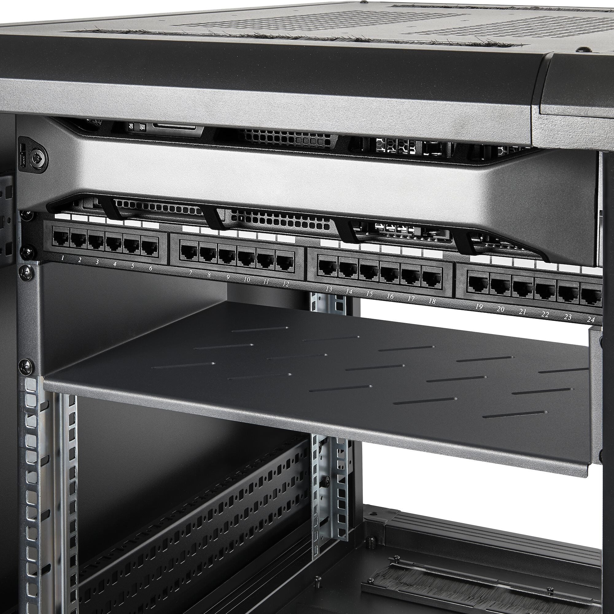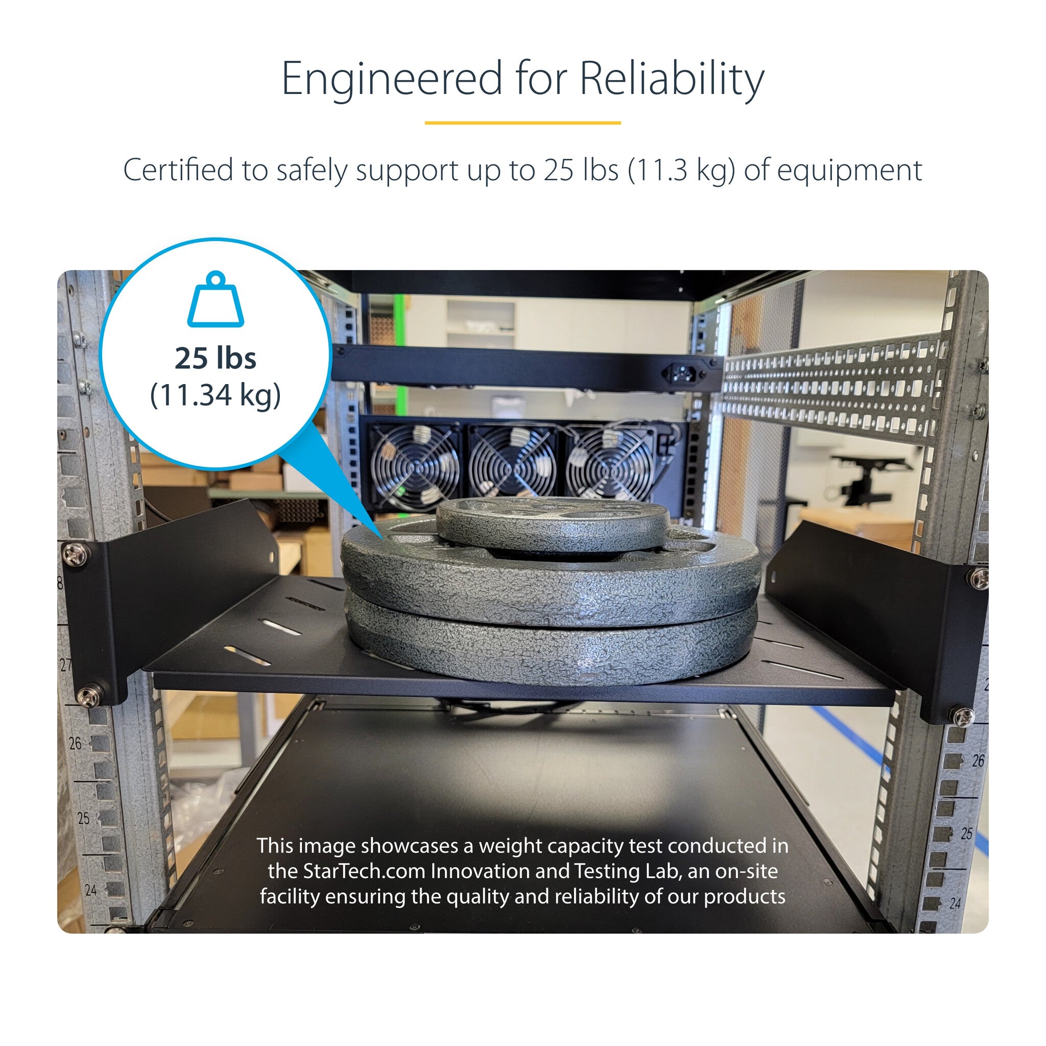 The fixed-rack shelf is made of 16-gauge (1.4mm) SPCC steel for long-term durability and sturdiness while supporting up to 25lb (11.3kg) of equipment. Accommodate server rack equipment, accessories, or non-mountable devices for ease of access and connectivity.
