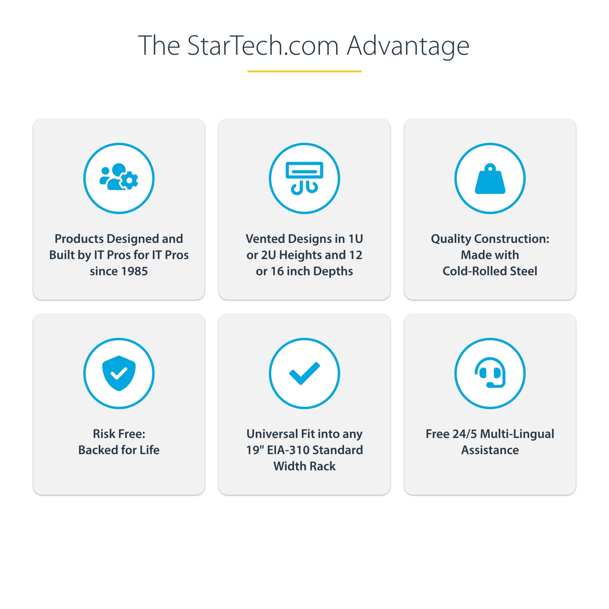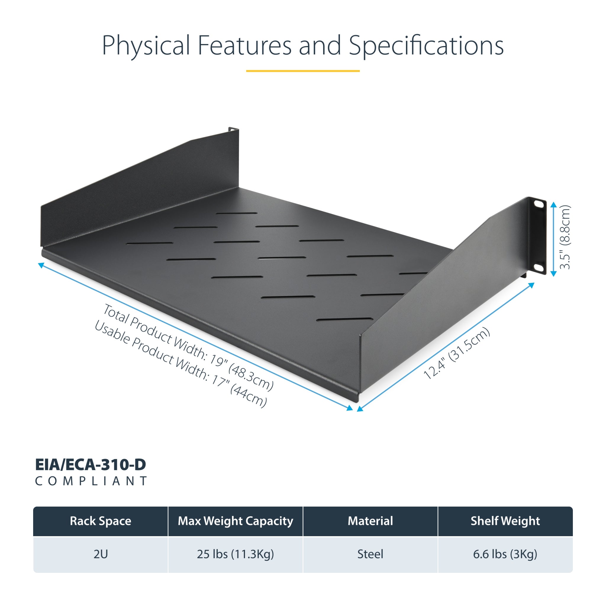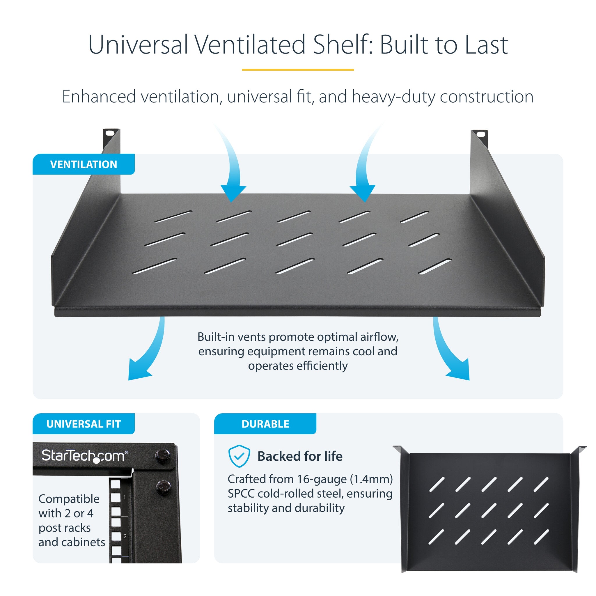 StarTech.com 2U Vented Server Rack Shelf, 12" (31.5cm) Mounting Depth, Cantilever Tray For 19" Rack/Cabinet, Heavy-Duty Steel, Up To 25lb/11.3kg, Includes Cage Nuts/Screws