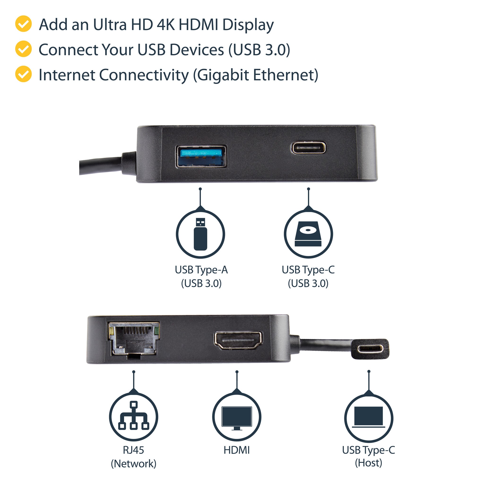 This USB-C Multiport Adapter with HDMI combines the capability of three single-function adapters, a USB-C video adapter, USB-C to USB 3.0 adapter, and Gigabit Ethernet adapter, into a portable docking station for your laptop. You can connect a 4K HDMI display and two USB 3.0 devices (1x USB-A, 1x USB-C), and get high-speed network access, all through a single cable.