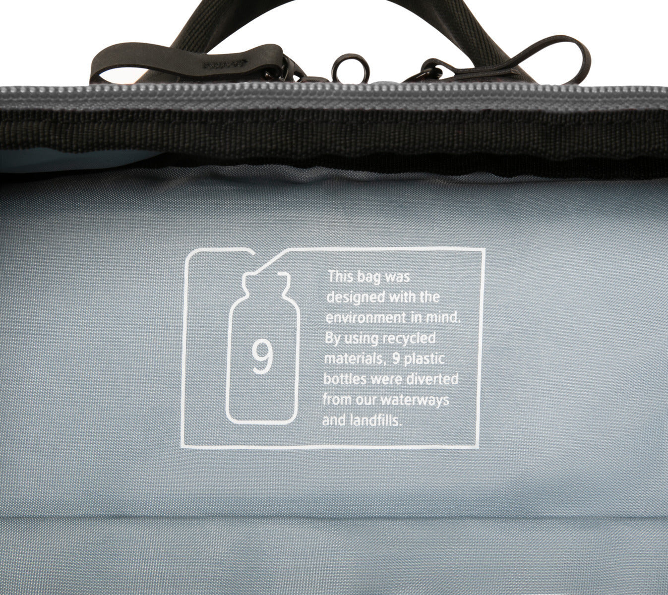 This bag was designed with the environment in mind. By using GRS-certified recycled materials, 9 plastic bottles were kept out of our waterways and landfills, shredded into small flakes, re-polymerised into plastic pellets, and heated and spun into yarn that was stitched, and sewn into the fabric of this EcoSmart® bag.